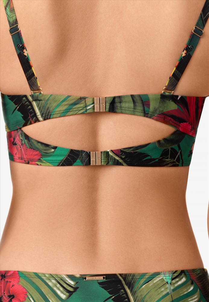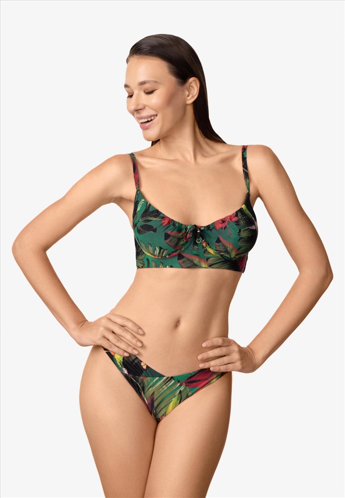 Топ с мягкой чашкой на каркасной поддержке. Тонкие съемные корректоры внутри. По линии декольте регулируемая кулиска с звязками по центру. Регулируемые бретели фиксируются на спине. На спине двойная застежка.