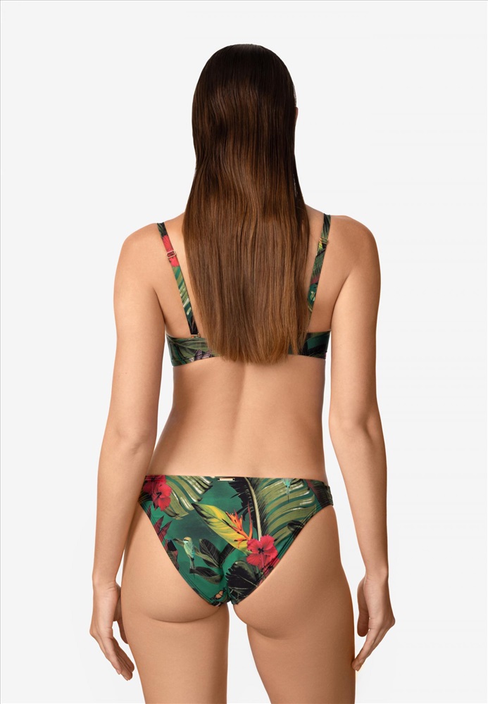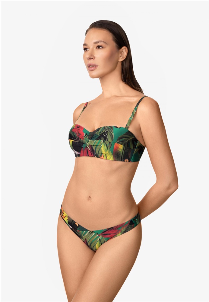 Формованная чашка «бандо» со съемным корректором «пуш-ап» на каркасной поддержке. Спереди декоративный перекрут. Регулируемые съемные бретели.