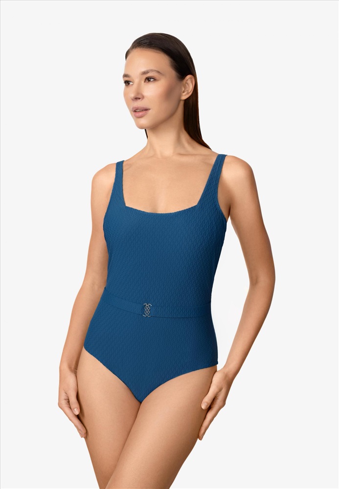 Мягкая чашка на каркасной поддержке, без корректоров. Завышенный вырез по линии бикини. Декоративный пояс с аксессуаром.