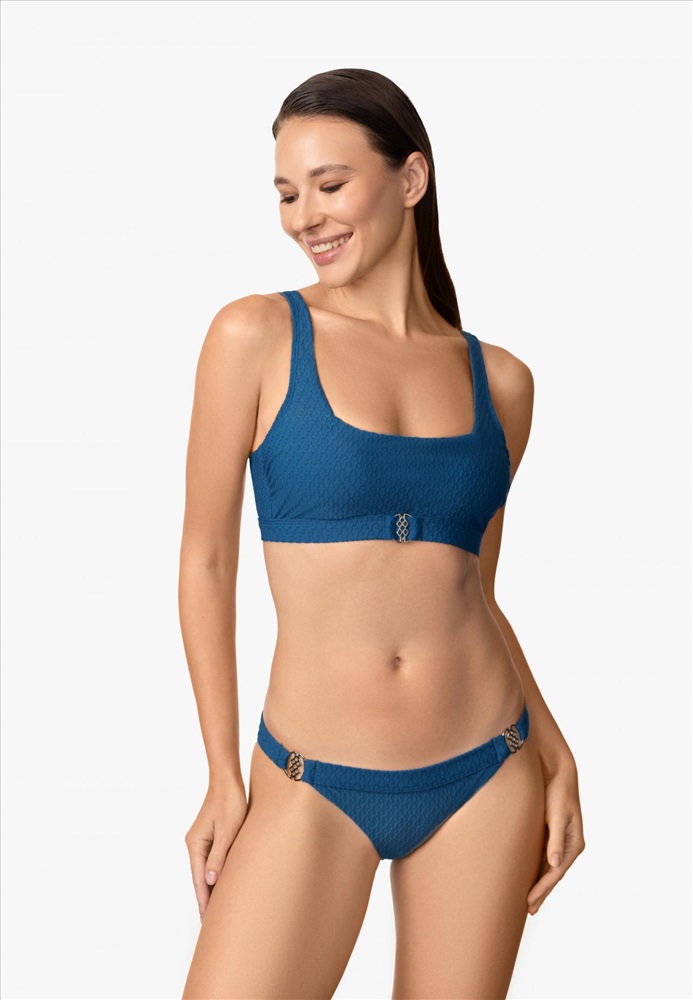 Мягкий топ на каркасной поддержке. Широкие регулируемые бретели фиксируются на спине. Спереди по линии низа в центре аксессуар. На спине застежка.