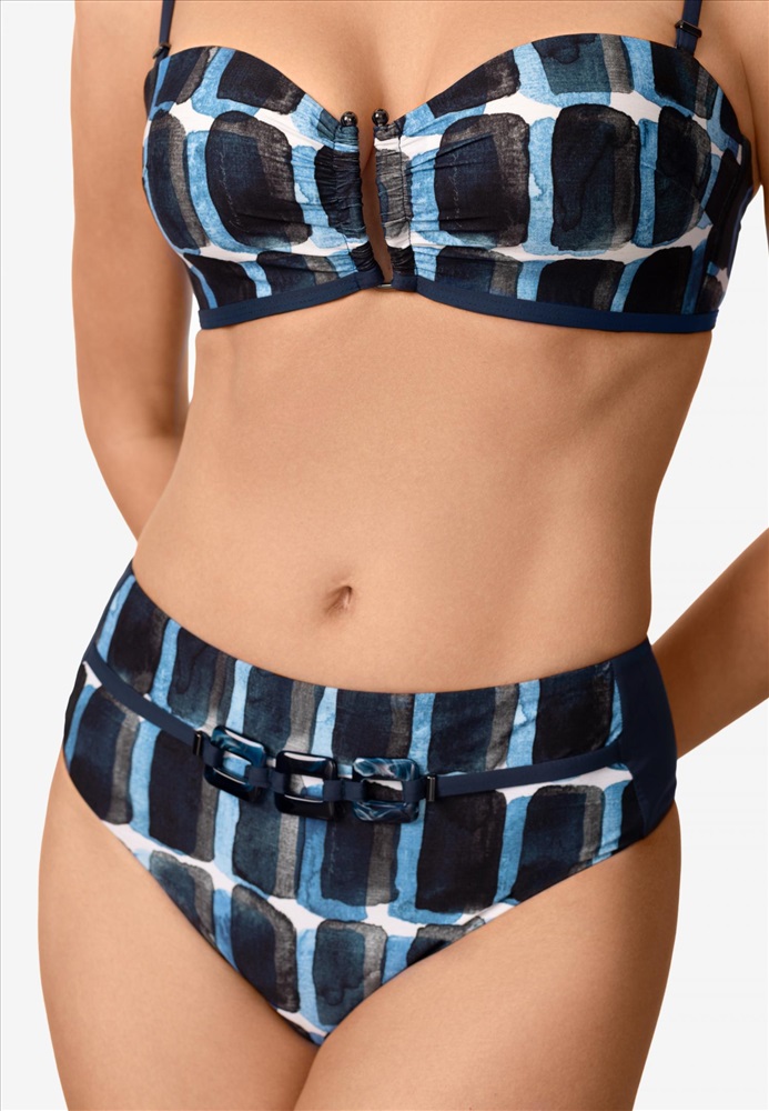 Брифы-бразилиана с завышенной линией талии. На передней детали декоративный пояс с аксессуаром. Завышенный вырез по линии бикини.