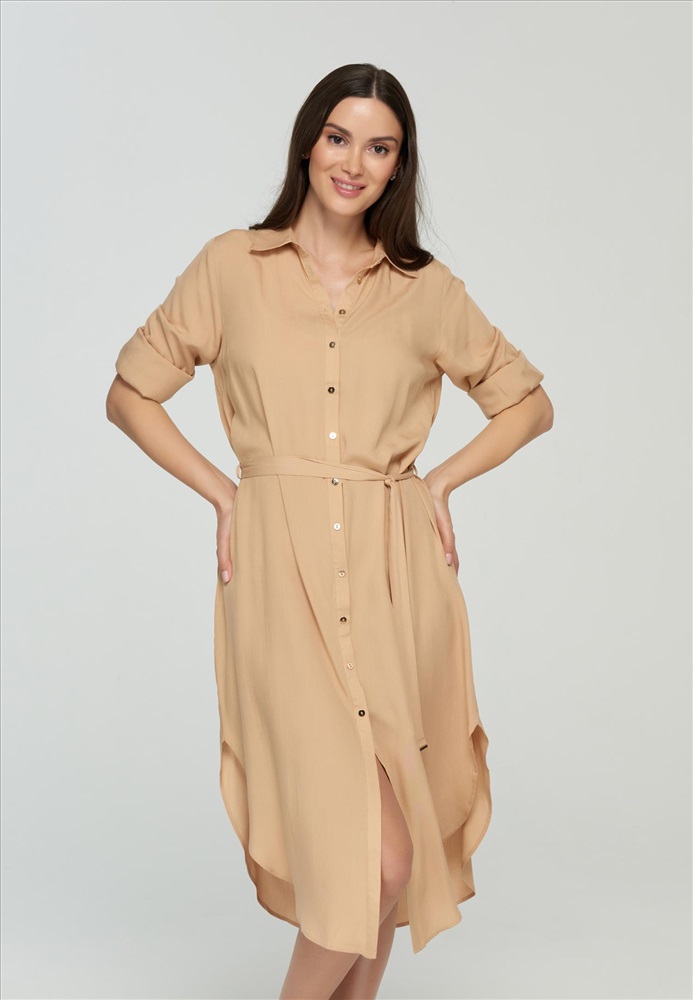 Платье - рубашка прямого кроя с застежкой на пуговицах. Съемный пояс. Длина ниже уровня колен. Карманы в боковых швах. Длина рукава регулируется патой с застежкой.