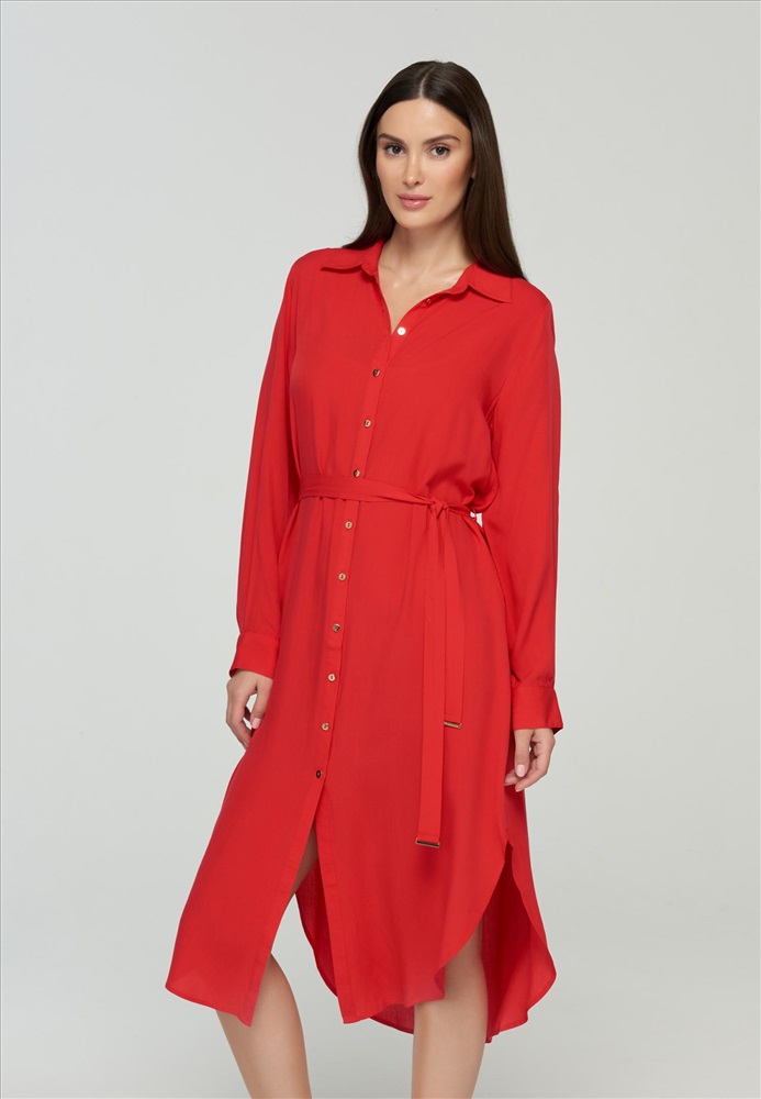 Платье - рубашка прямого кроя с застежкой на пуговицах. Съемный пояс. Длина ниже уровня колен. Карманы в боковых швах. Длина рукава регулируется патой с застежкой.