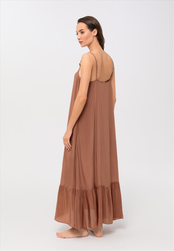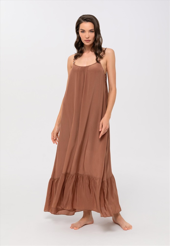 Длинный сарафан свободного кроя на тонких бретелях, дублирован подкладкой. Регулируемые бретели украшены аксессуарами. Длина до щиколотки.