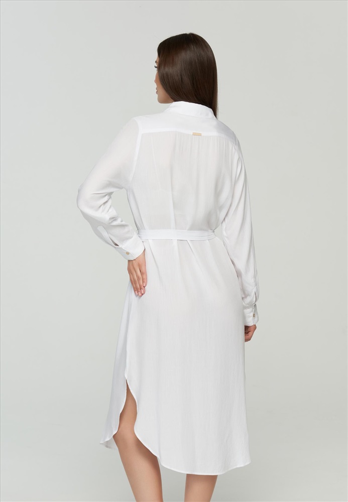 Платье-рубашка прямого кроя с застежкой на пуговицах. Съемный пояс. Длина ниже уровня колен. Карманы в боковых швах. Длина рукава регулируется патой с застежкой.