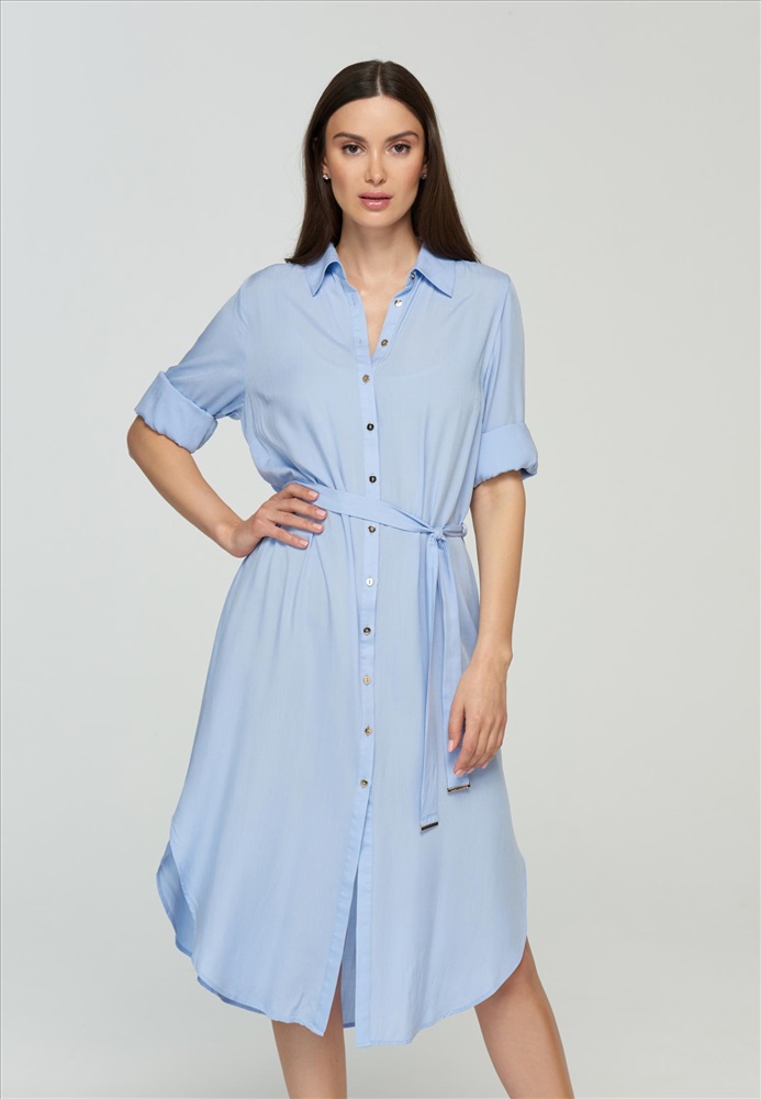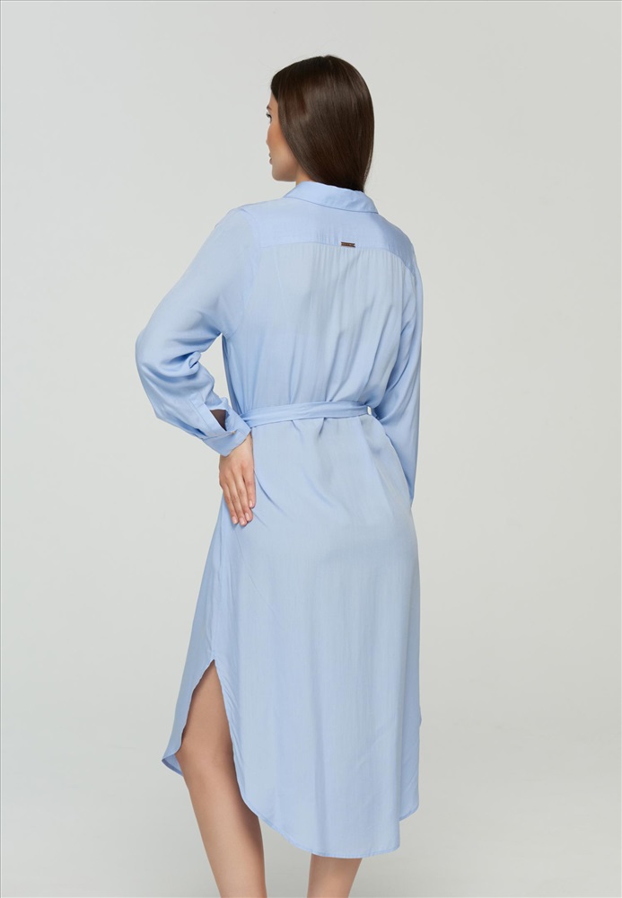 Платье-рубашка прямого кроя с застежкой на пуговицах. Съемный пояс. Длина ниже уровня колен. Карманы в боковых швах. Длина рукава регулируется патой с застежкой.