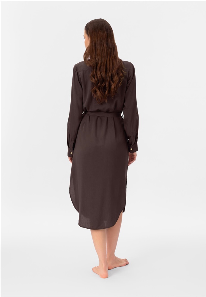 Платье-рубашка прямого кроя с застежкой на пуговицах. Съемный пояс. Длина ниже уровня колен. Карманы в боковых швах. Длина рукава регулируется патой с застежкой.