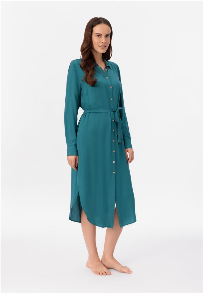 Платье-рубашка прямого кроя с застежкой на пуговицах. Съемный пояс. Длина ниже уровня колен. Карманы в боковых швах. Длина рукава регулируется патой с застежкой.
