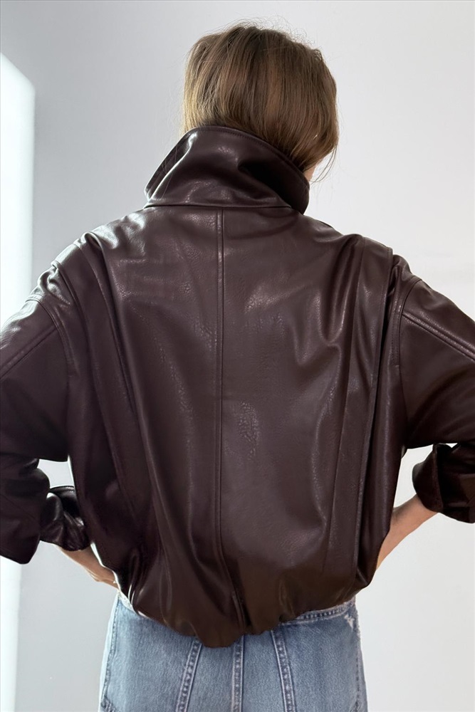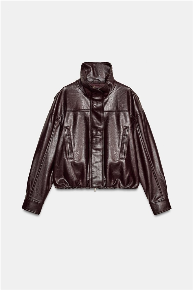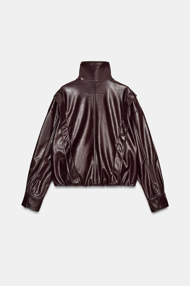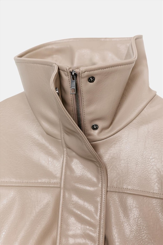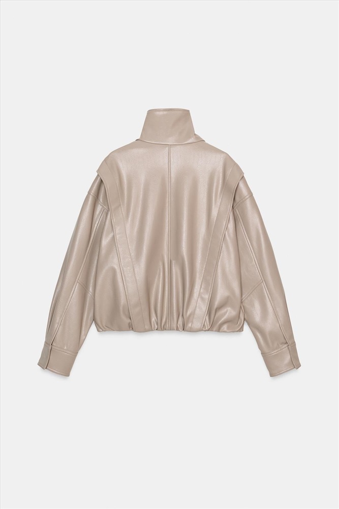 Jacket with a high collar and long sleeves with elasticated cuffs. Side pockets. Interior lining. Elastic hem. Zip-up front with a placket concealing snap buttons.