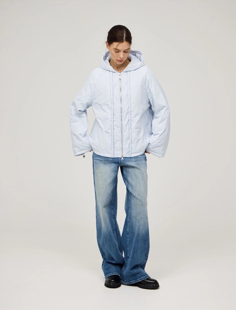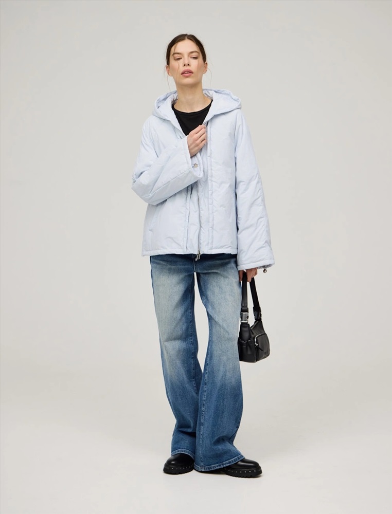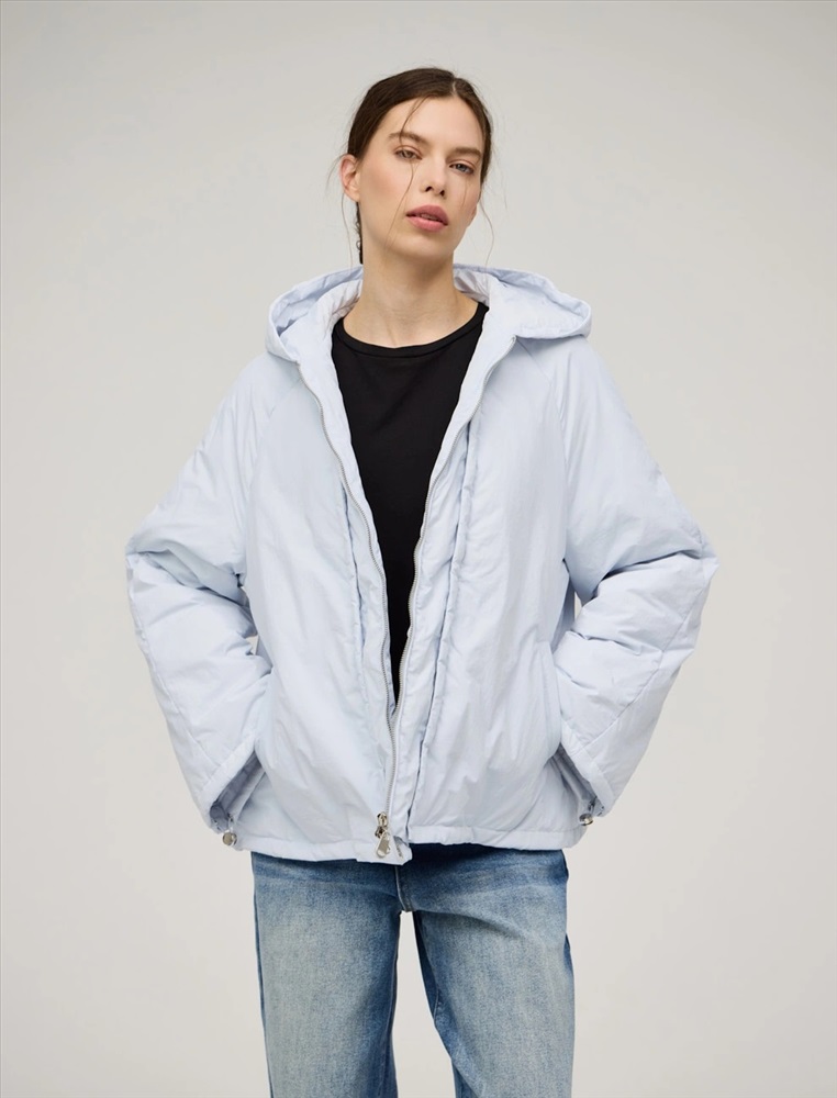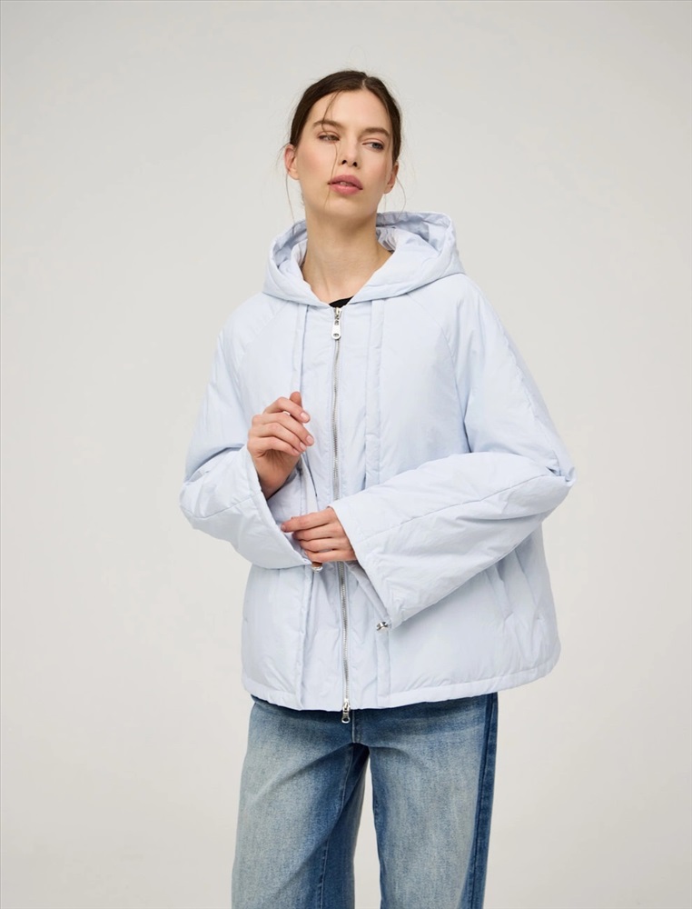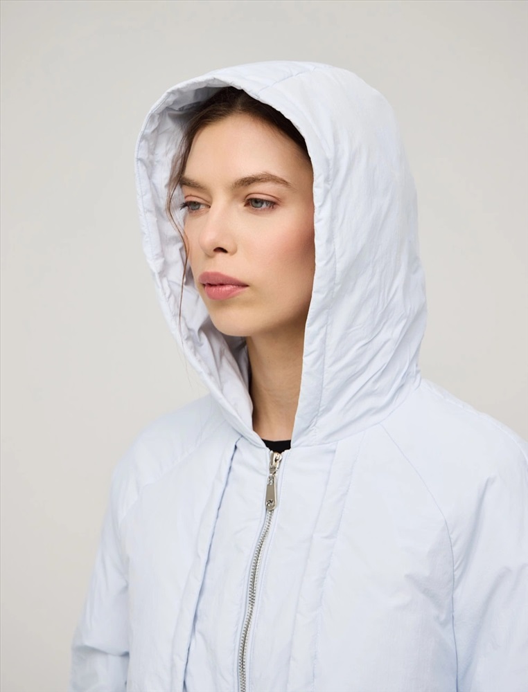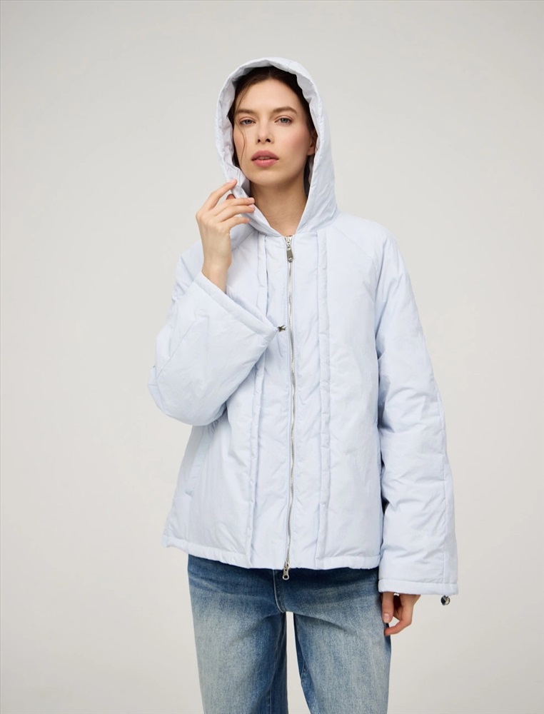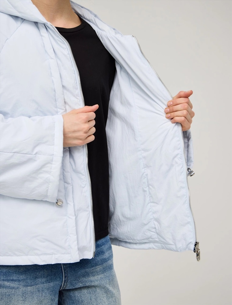 Куртка регулярного силуэта с рукавом по типу реглан и капюшоном. По передней части изделия — застежка на молнию. По низу изделия и по рукавам функциональная кулиска на резинке и фиксаторах. По переду куртки имитация многослойности за счет декоративных деталей. Ткань верха и подкладка выполнены из полиэстера. Представлена в голубом цвете. В составе утеплителя утиный пух (90%) и утиное перо, обеспечивающие тепло и легкость в носке.