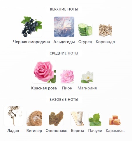 Верхние ноты: Черная смородина, Альдегиды, Огурец и Кориандр; средние ноты: Красная роза, Пион и Магнолия; базовые ноты: Ладан, Ветивер, Опопонакс, Береза, Пачули и Карамель.