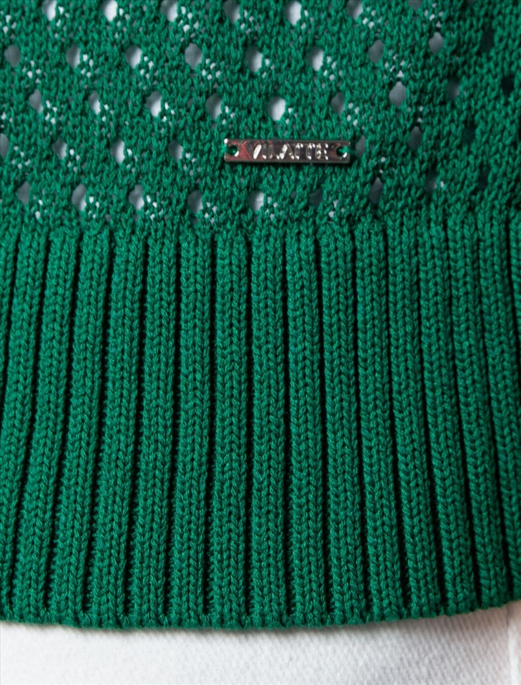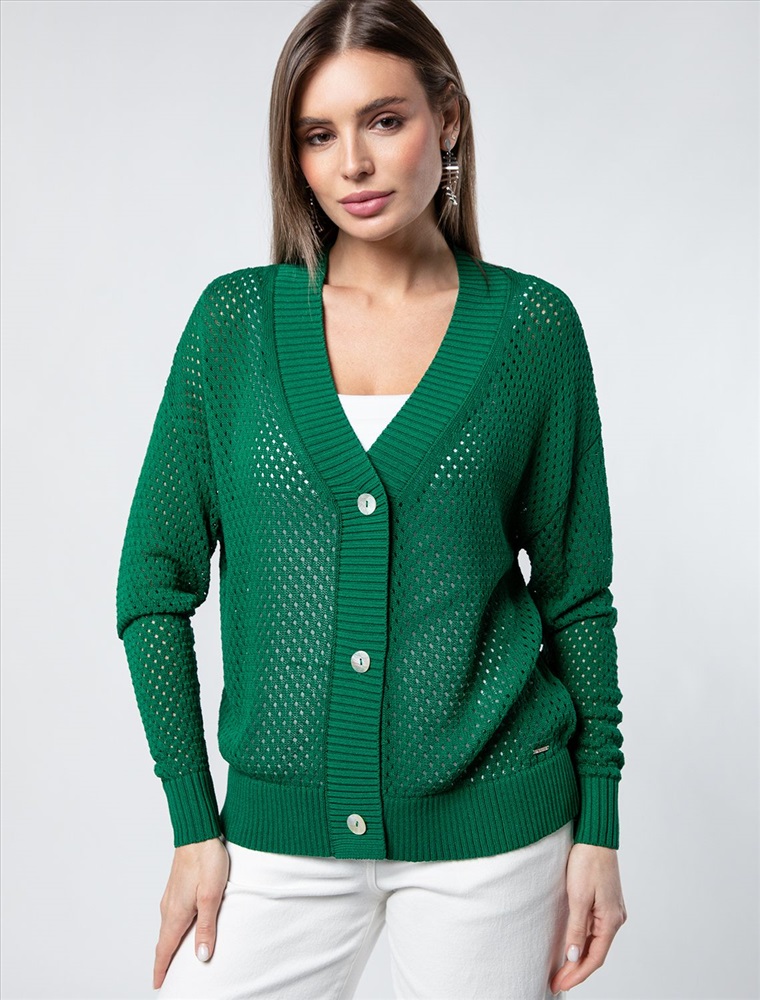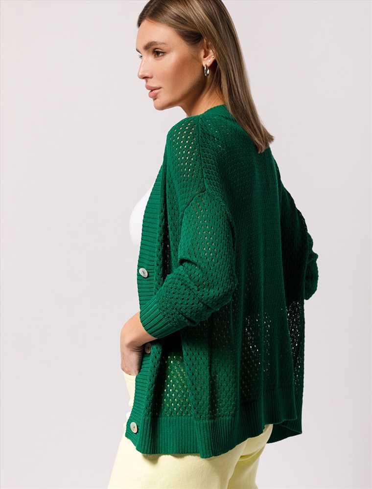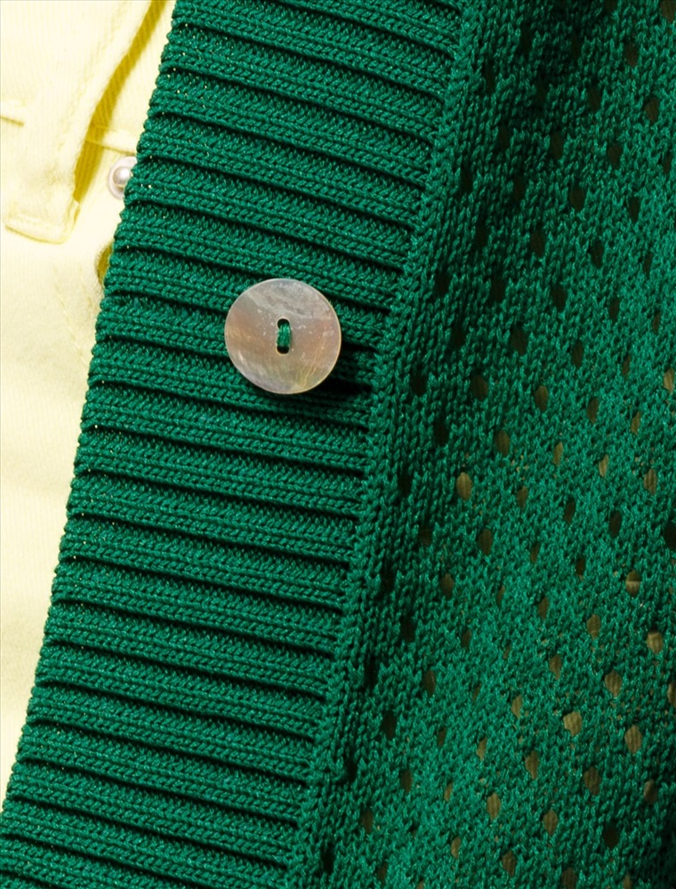 Жакет связан фактурным узором из тонкой пряжи на основе крученой вискозы с лиоцеллом. Изделие, дополненное перламутровыми пуговицами, прочное и сохранит форму даже после множества стирок. В таком жакете будет комфортно даже в жаркое время года. Можно носить с бежевым бельем или хлопковым топом.