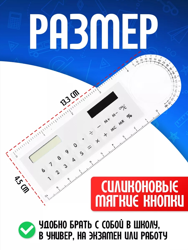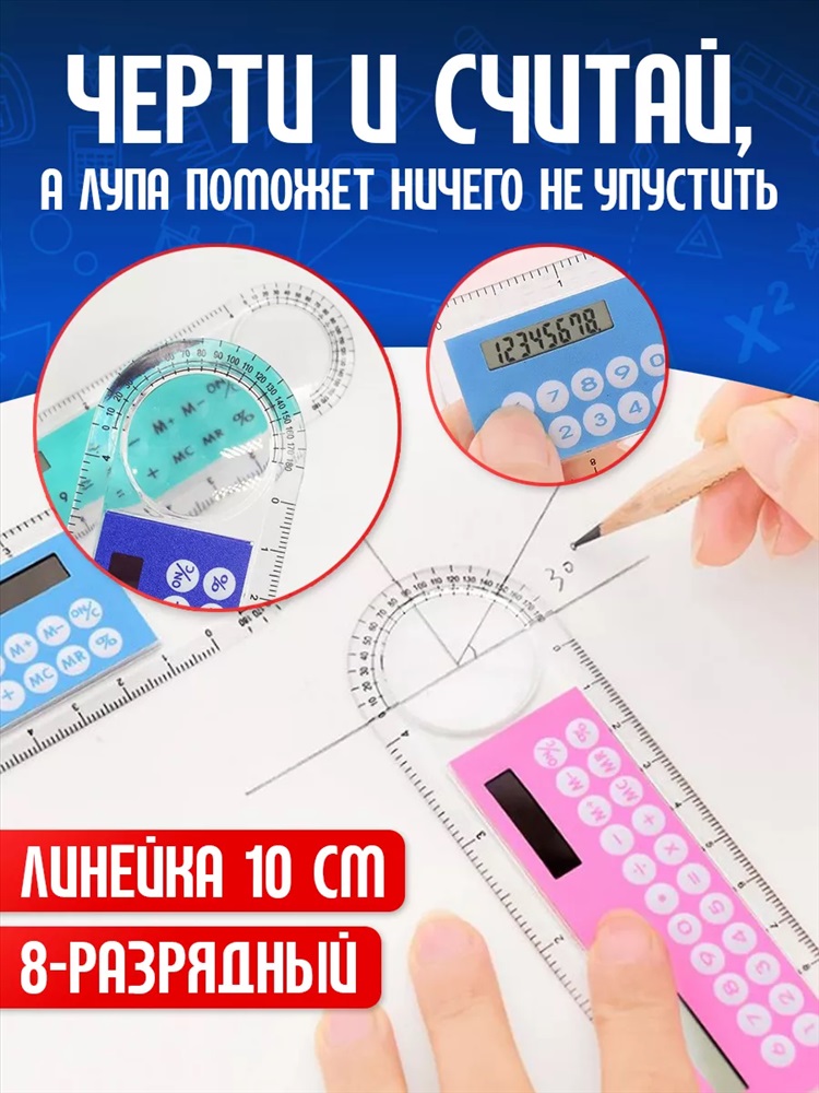 Стиль: для школы Карманная линейка - калькулятор послужит настоящим помощником вашему ребенку. Эта линейка является уникальным предметом, у неё есть минии-калькулятор и лупа! Эта универсальная линейка калькулятор подойдет для школы, для офиса, для студентов. Стильный дизайн и приятный внешний вид. Все нашим калькуляторы для школы изготавливаются из высококачественных материалов, по этому прослужит Вам долгий срок. цвет приходит случайным образом.