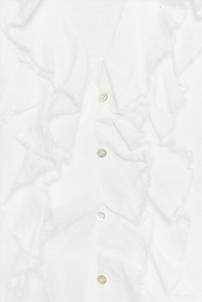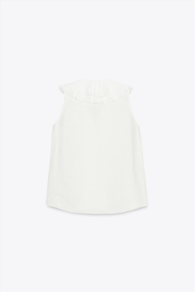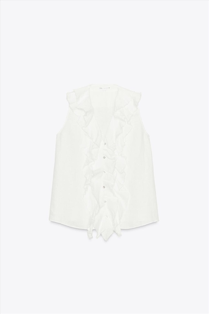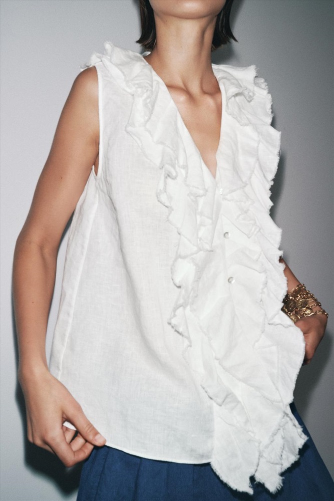 Shirt with main fabric made of 100% linen yarn. V-neck and sleeveless. Ruffle detail in the same fabric. Straight hem. Front button fastening.