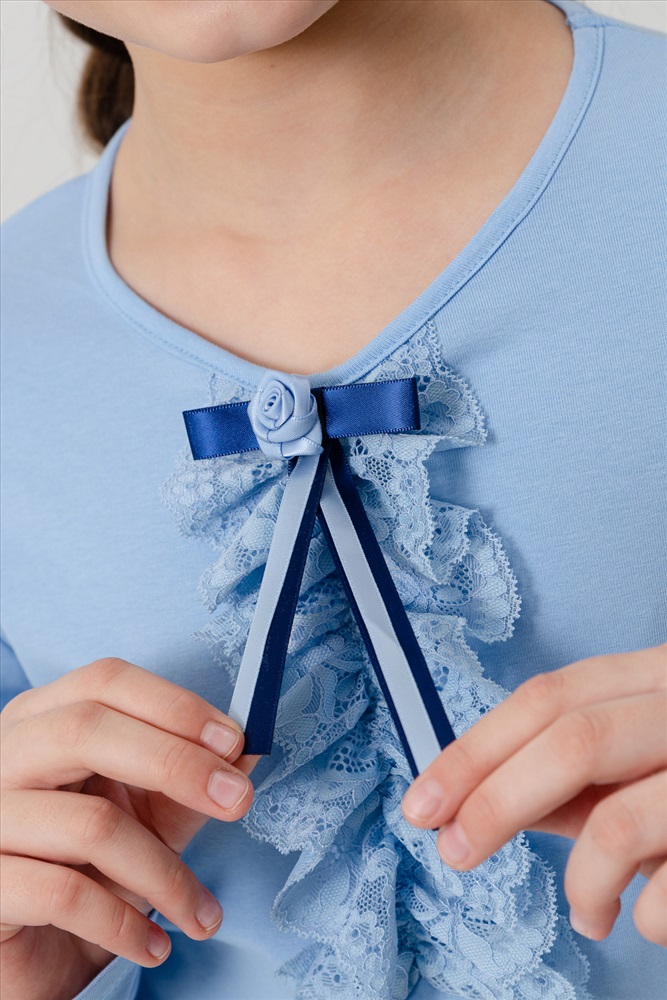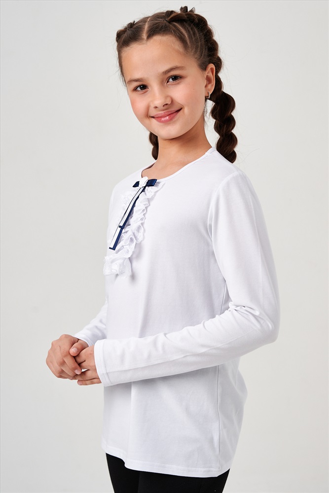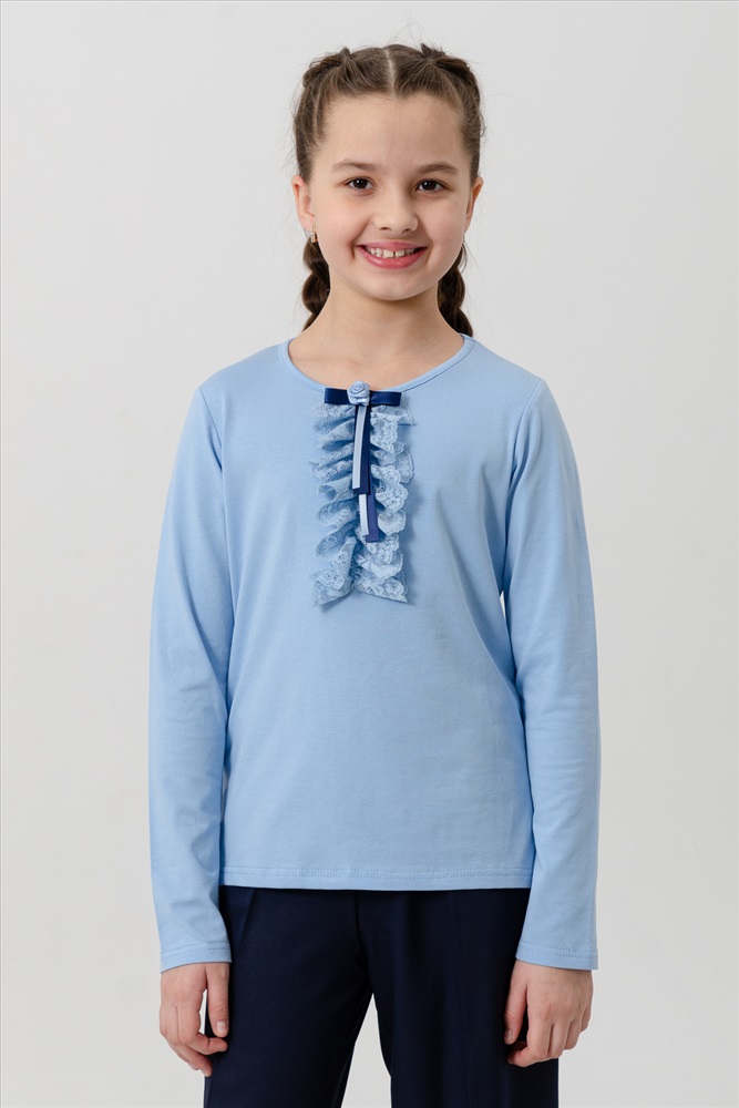 Застежка: без застежки Блузка для девочек младшего и старшего школьного возраста, из однотонного трикотажного полотна. Блузка прилегающего силуэта, с втачным рукавом. Спереди и на спинке отсутствуют линии членения. По центру переда настрочено жабо из кружева. Рукава длинные. Низа рукавов и изделия подогнуты. Горловина окантована. Спереди прикреплен декоративный элемент.