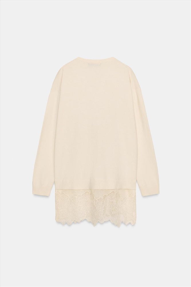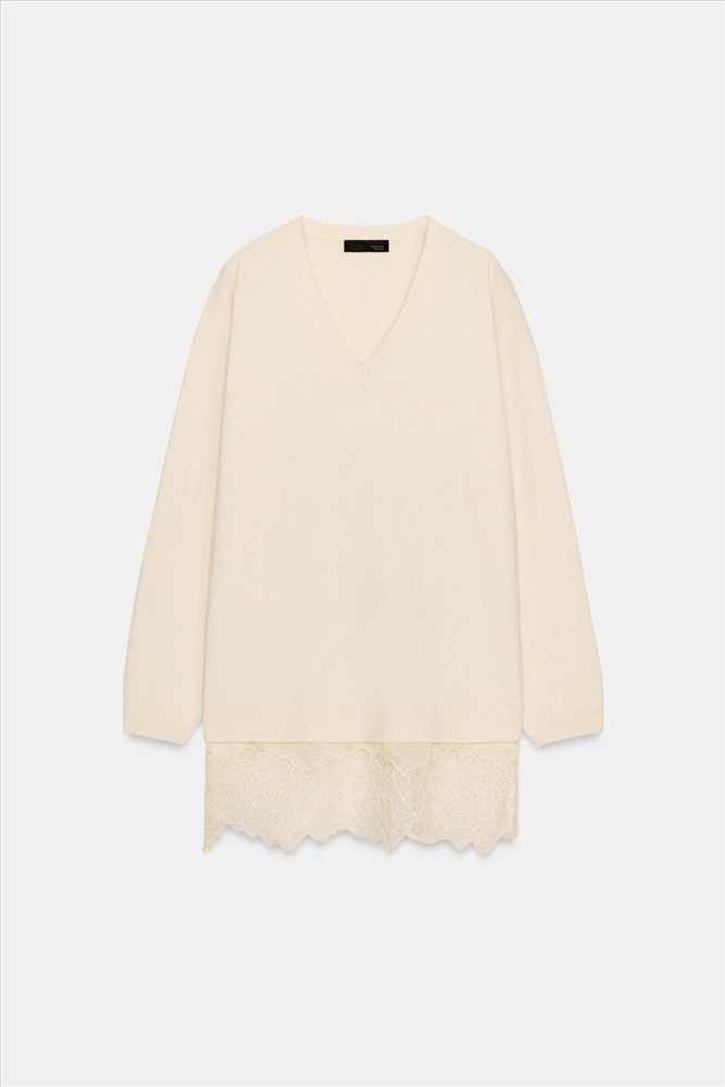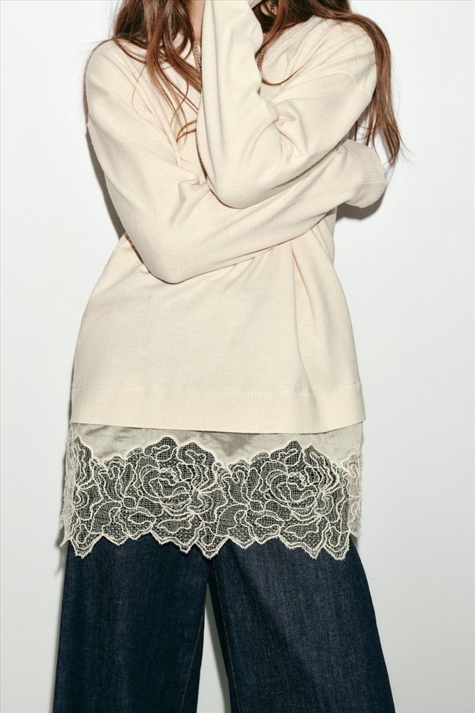 V-neck long sleeve jumper. Hem with combined lace fabric. COMPOSITION, CARE & ORIGIN COMPOSITION OUTER SHELL MAIN FABRIC 8% wool EMBELLISHMENT 9% cotton Which contains at least: OUTER SHELL EMBELLISHMENT 6% RCS certified recycled acrylic 9% RCS certified recycled cotton 31% RCS certified recycled polyester MAIN FABRIC 16% RCS certified recycled acrylic 69% RCS certified recycled polyester CERTIFIED MATERIALS RCS CERTIFIED RECYCLED POLYESTER Nowadays, recycled polyester is mainly made from PET plastic waste. This is a type of plastic that is widely used in a variety of items, such as plastic bottles. Using recycled materials helps limit the production of virgin polyester fibre. It is certified to the Recycled Claim Standard (RCS), which verifies the recycled content and tracks it from source to final product. Certified by Intertek 193341 More information RCS CERTIFIED RECYCLED COTTON This fibre is made from recycled cotton textile waste. Using recycled materials helps limit the consumption of raw materials. It is certified to the Recycled Claim Standard (RCS), which verifies the recycled content and tracks it from source to final product. Certified by Intertek 193341 More information RCS CERTIFIED RECYCLED ACRYLIC This material is made from recycled acrylic waste from other production processes. Transforming waste into new materials helps limit the extraction of raw materials. It is certified to the Recycled Claim Standard (RCS), which verifies the recycled content and tracks it from source to final product. Certified by Intertek 193341 More information CARE Caring for your garments to extend their useful life. Lower temperature washes and delicate spin cycles are gentler on garments and help to protect the colour, shape and structure of the fabric.