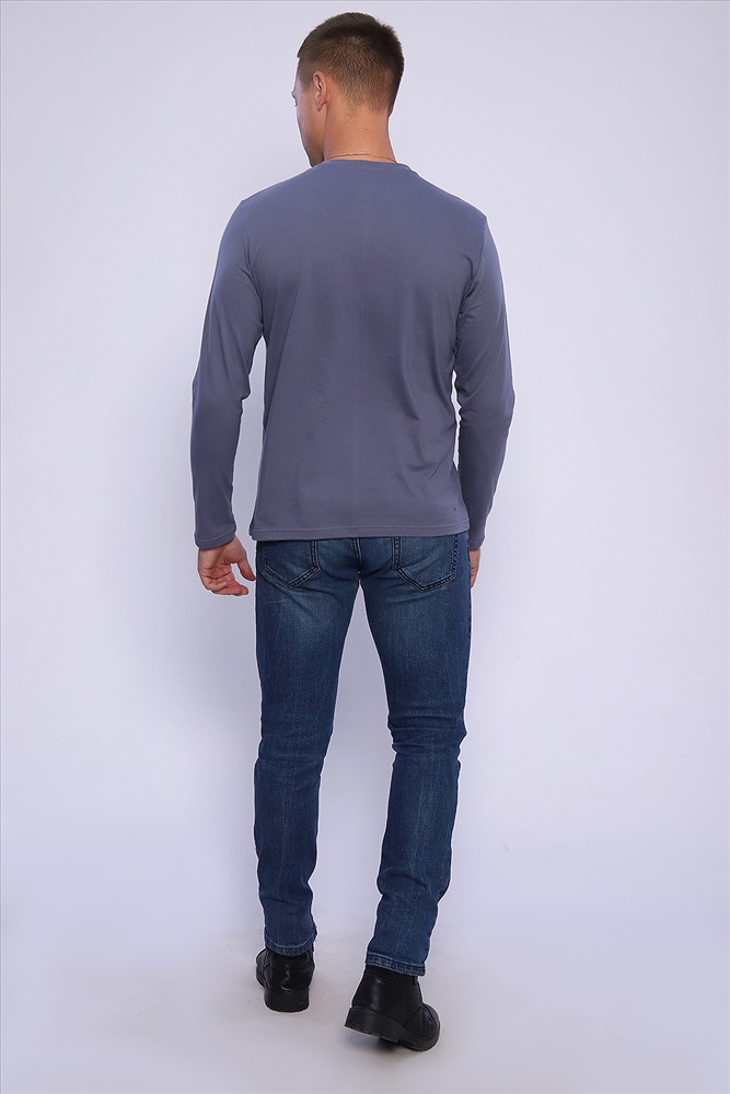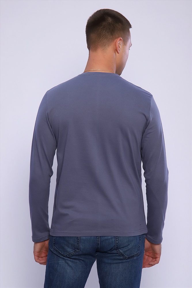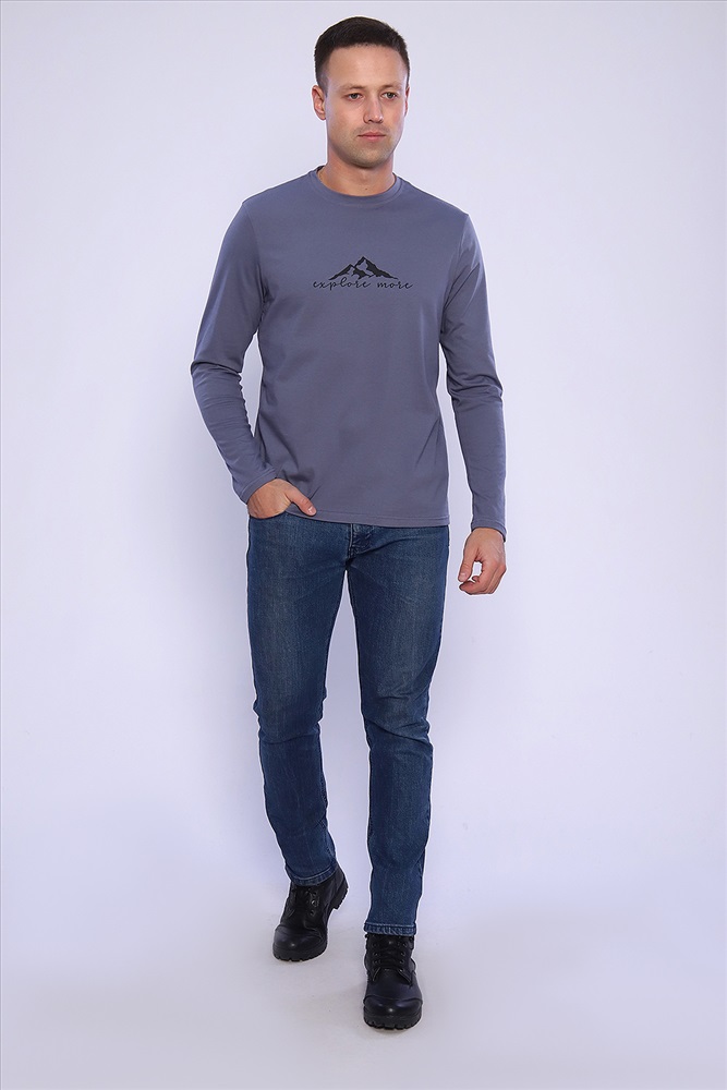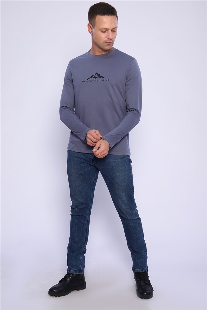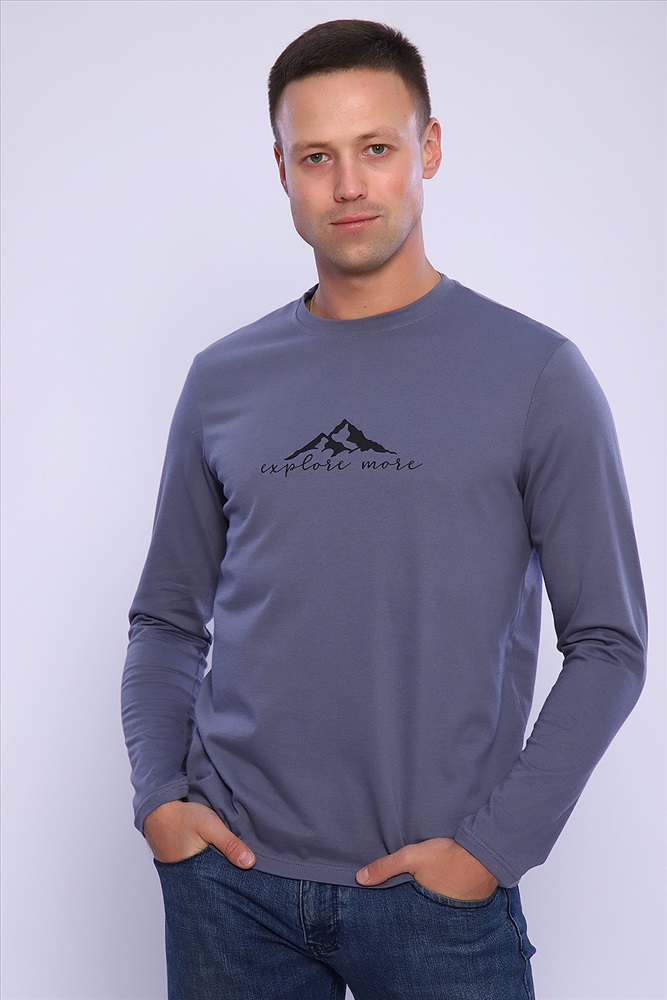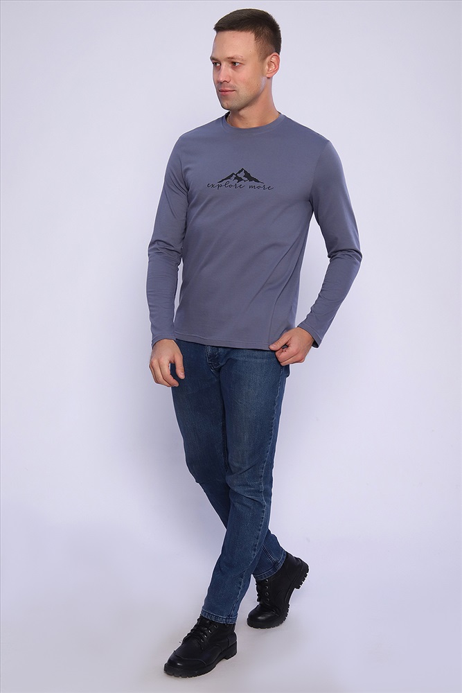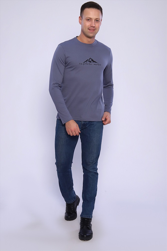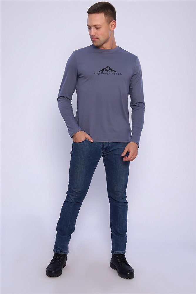 Застежка: без застежки Мужская футболка с длинным рукавом, округлой горловиной обработанной усилителем, на полочке принт . Лонгслив имеет свободный покрой и классическую, не спущенную линию плеча.