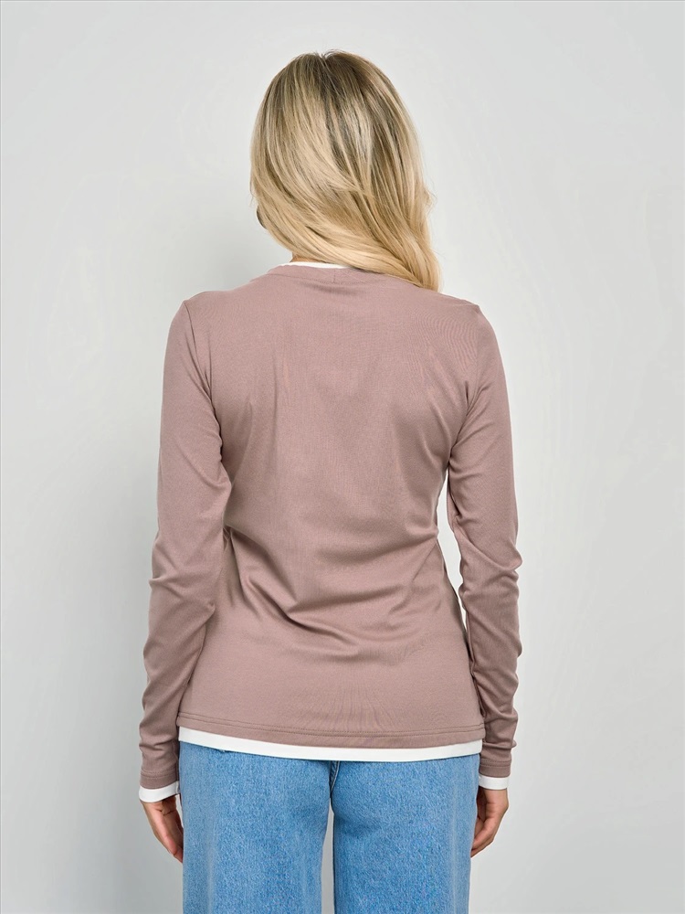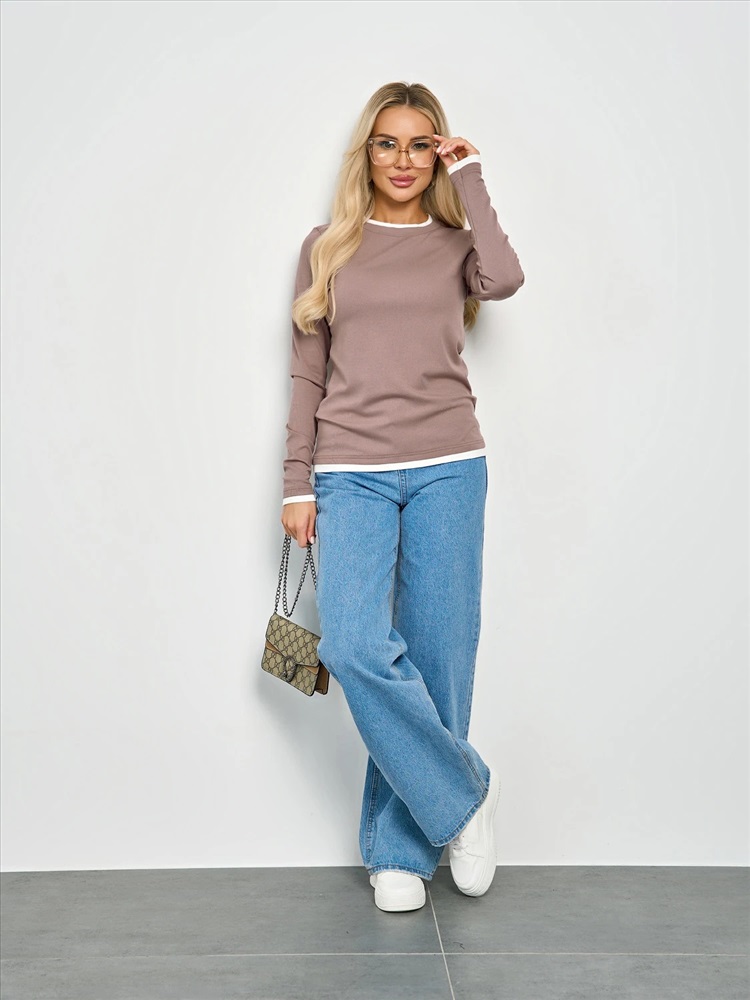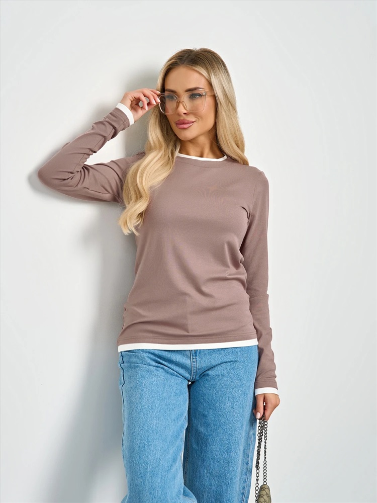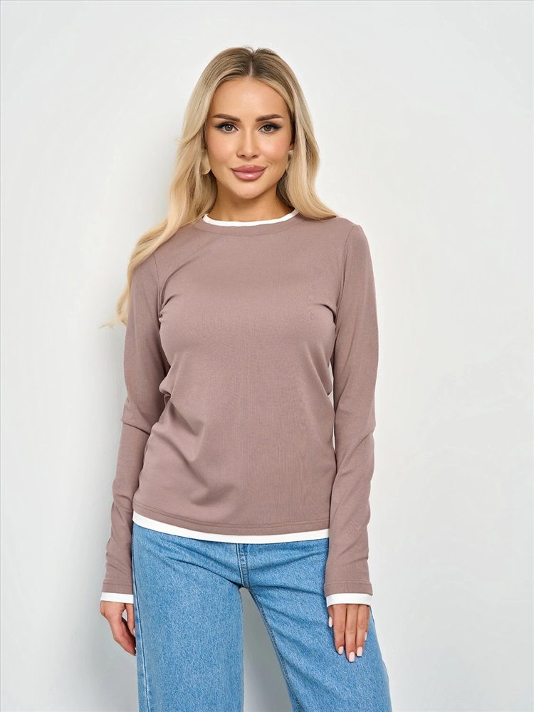 Круглый вырез. Длинные втачные рукава. Горловина, низ рукава и низ изделия отделаны контрастным материалом, имитирующим второй слой. Комментарии к товару