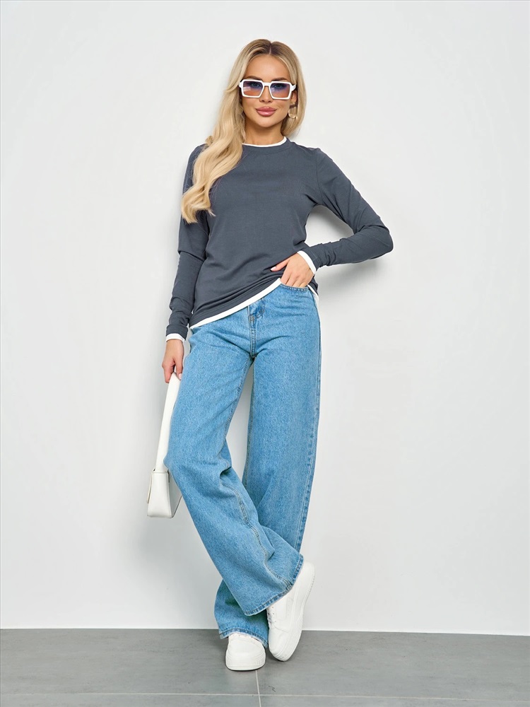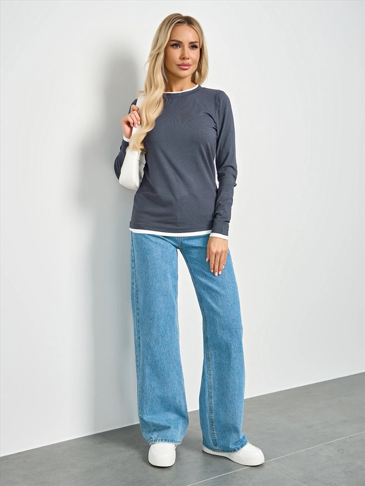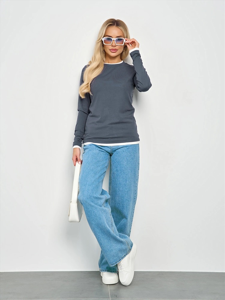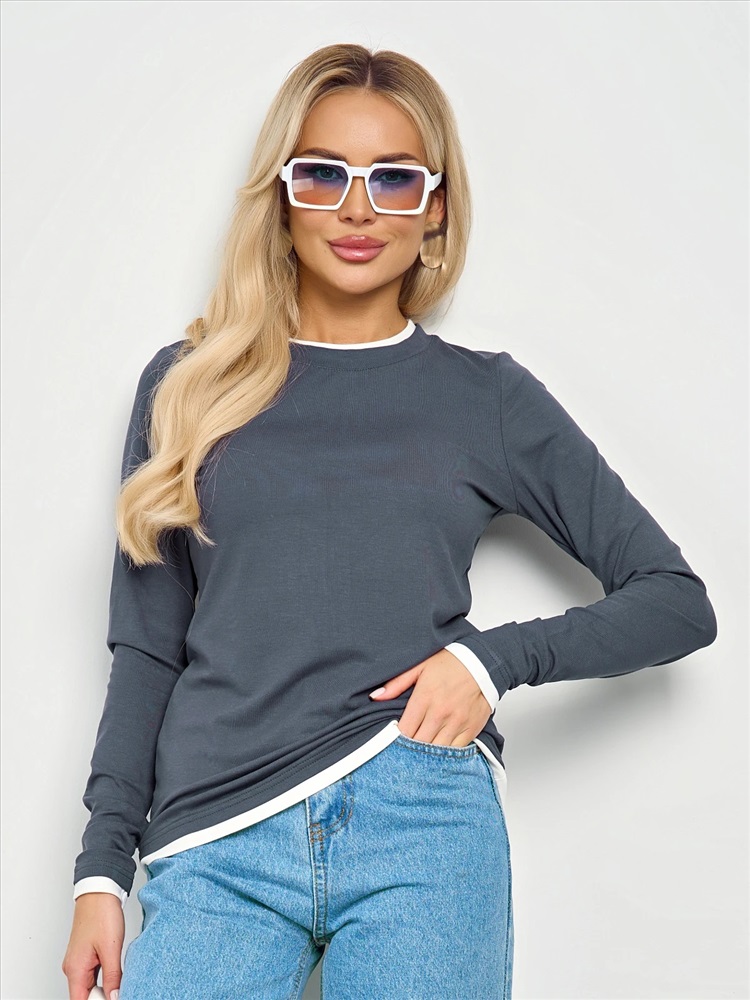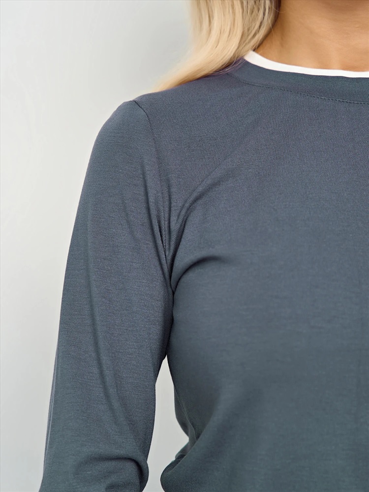 Круглый вырез. Длинные втачные рукава. Горловина, низ рукава и низ изделия отделаны контрастным материалом, имитирующим второй слой. Комментарии к товару