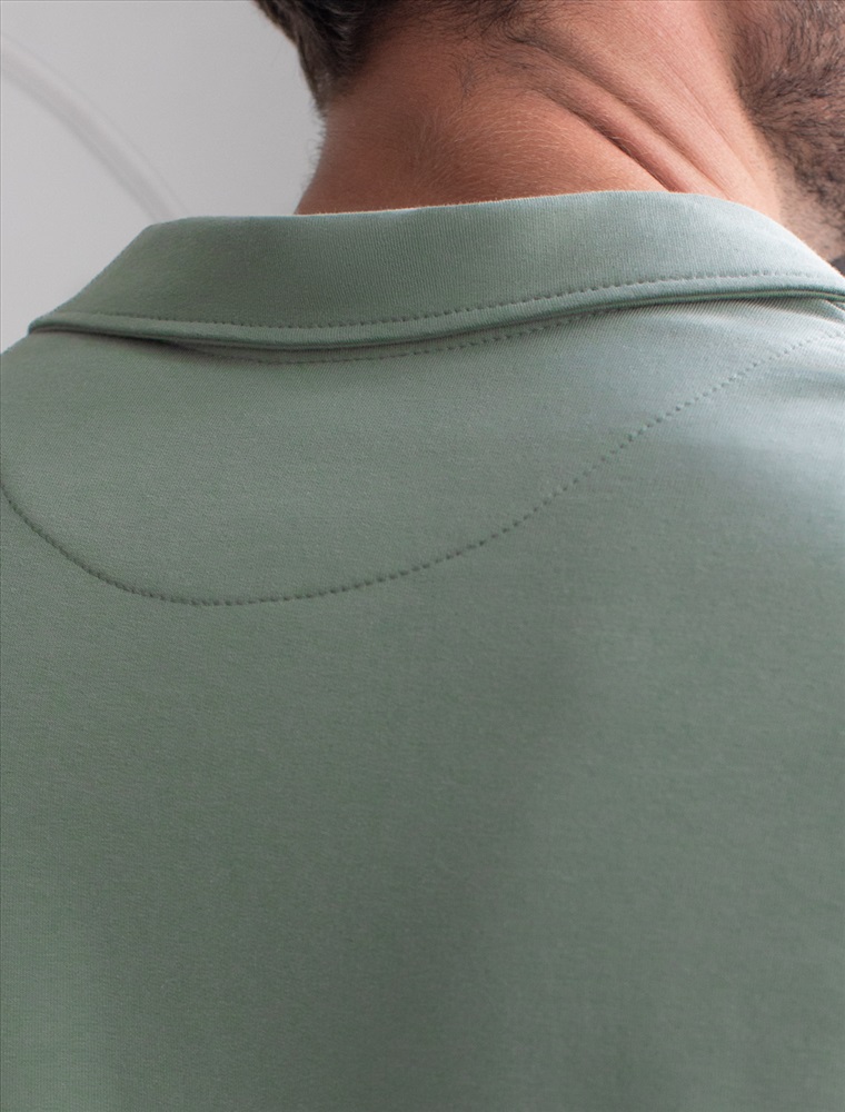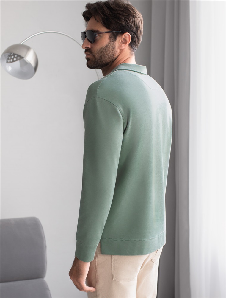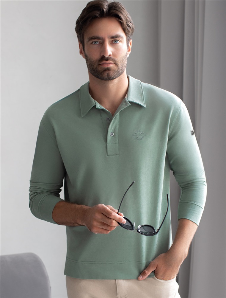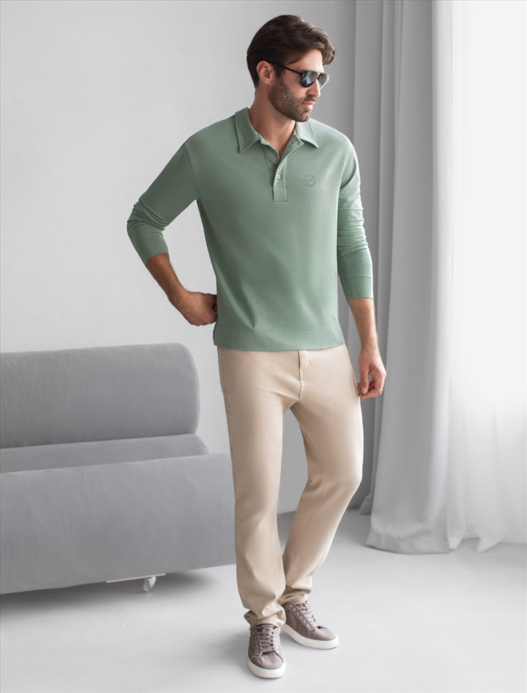 Плотность: 240 Г/м2 Размер товара на первом фото: 42 Стильный лонгслив светло-оливкового цвета с воротником поло выполнен из премиального хлопка в сочетании с эластаном . Натуральная ткань обеспечивает легкость, воздухопроницаемость и приятные тактильные ощущения даже когда жарко, позволяет не перегреваться и поддерживает комфортный микроклимат в течение всего дня. Удобный отложной воротник на аккуратных пуговицах делает образ современным и стильным, а длинный рукав защищает руки при ветреной погоде. Поло хорошо садится по фигуре благодаря добавлению эластичных волокон — такой вариант подходит для мужчин любого роста и размеров, не стесняет движений и создает ощущение свободы и легкости. Лонгслив с пуговицами дополнен небольшими разрезами по бокам и ненавязчивой вышивкой в виде надписи в тон основному цвету, которые придают образу индивидуальность, не перегружая его лишними акцентами. Лаконичная вышивка служит оригинальным декоративным элементом, гармонично вписываясь в общий минималистичный облик. Такой подход делает лонг универсальным решением для тех, кто ценит простоту и стремится подчеркнуть свой вкус через детали. Перевод надписи Wanderlust - Страсть к путешествиям. Легкий джемпер идеально комбинируется как с классическими брюками, так и с джинсами или шортами — универсальность этой модели оценит каждый мужчина, предпочитающий удобную одежду для активного дня. Комментарии к товару