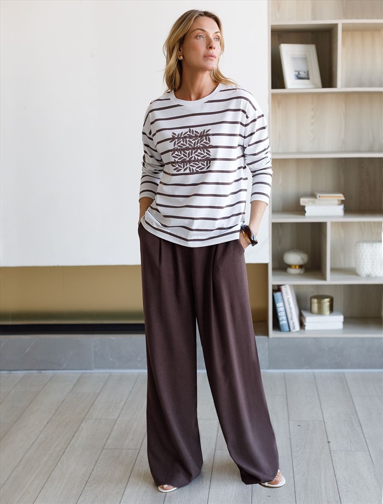 Плотность: 170 Г/м2 Свободный лонгслив белого цвета в кофейную полоску с длинным рукавом выполнен из премиального хлопка с добавлением эластана, плотностью 170 Г/м2, что обеспечивает комфорт и приятные тактильные ощущения. Полоска - придает изделию легкую текстурность, принт в виде листиков, который нанесен красками с устойчивым покрытием, добавляет стиля и индивидуальности, а круглый ворот создает универсальный образ, который подойдет для повседневного использования. Такой лонгслив идеально подходит для весеннего и летнего сезона благодаря легкой и дышащей ткани. Представленная широкая размерная линейка позволяет выбрать оптимальный вариант на любую фигуру, в том числе на плюс-сайз, обеспечивая свободу движений и удобство на каждый день. Этот комфортный лонгслив станет отличной базой в гардеробе, сочетаясь с различными стилями одежды и создавая простой, но эффектный образ. Комментарии к товару