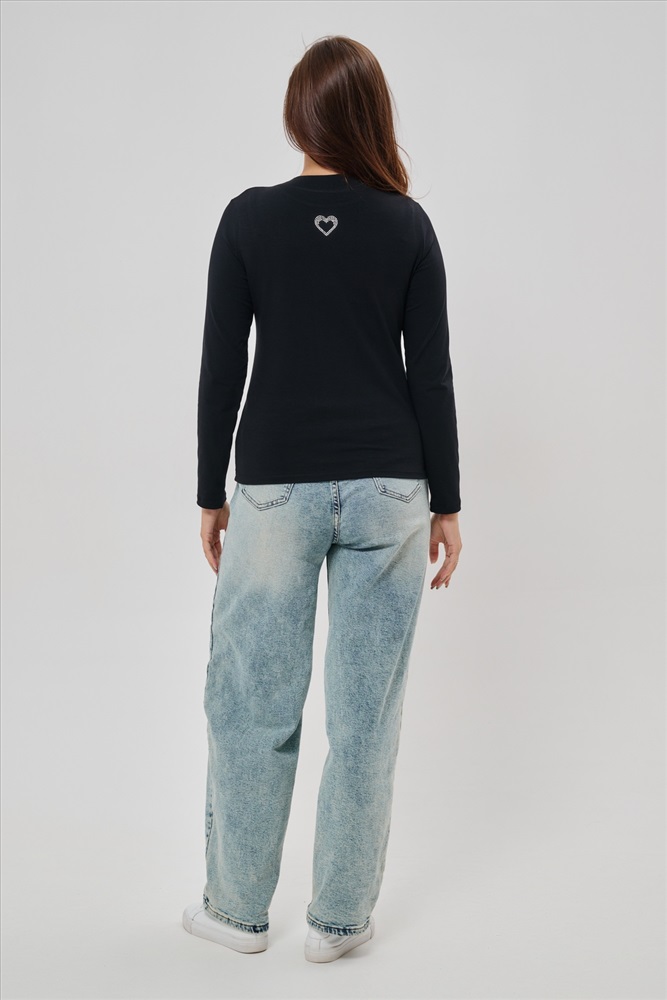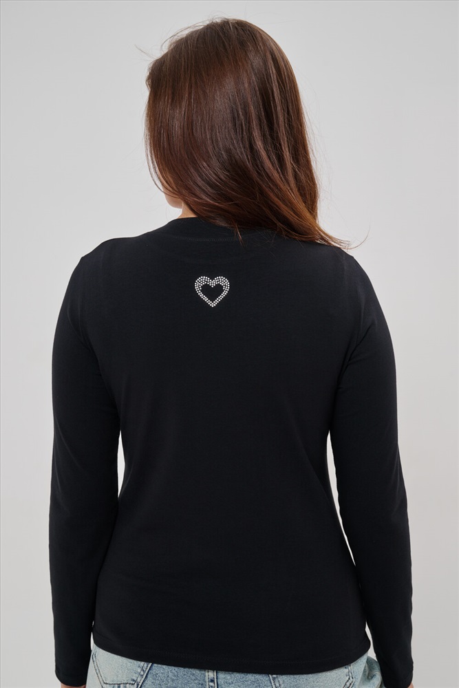 Застежка: без застежки Женский лонгслив из высококачественной кулирки обладающий умеренно приталенным силуэтом и круглым вырезом горловины. Представлен в базовых однотонных цветах, имеет дополнительную градацию размеров для оптимальной посадки. Задняя сторона украшена орнаментом из страз в форме сердца. Универсальная модель для межсезонья, успешно гармонирует с разнообразными элементами гардероба различного стиля.