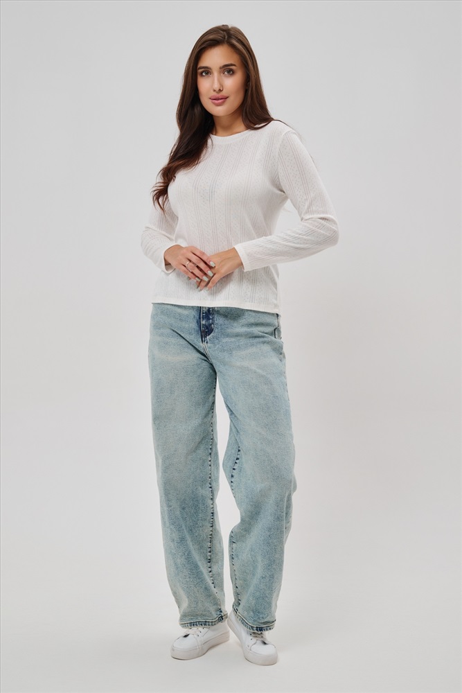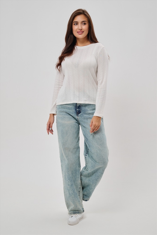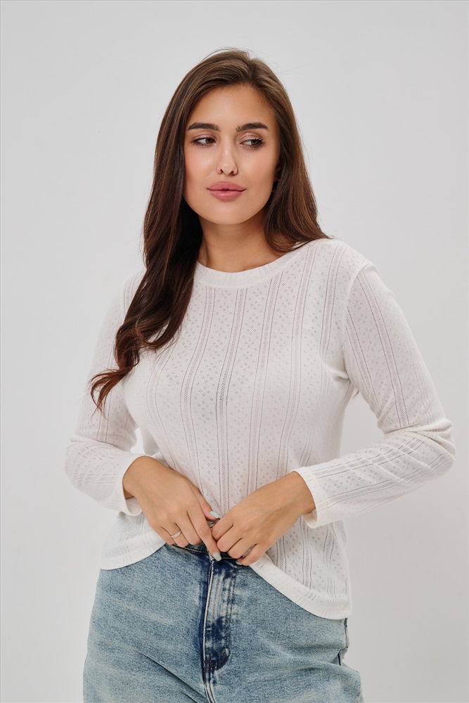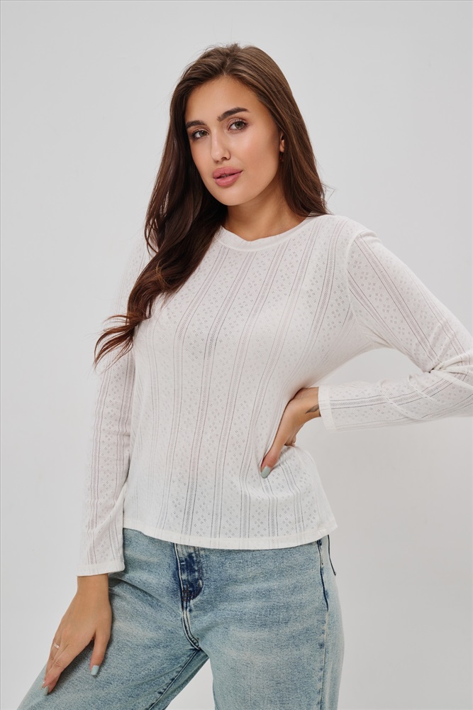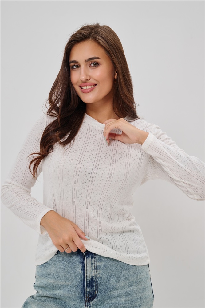 Застежка: без застежки Женский лонгслив из деликатного хлопкового трикотажа с ажурной вязкой. Приталенный крой создает изящный силуэт, подчеркивая природные очертания фигуры, а округлый вырез горловины обеспечивает удобство и эстетичное оформление зоны декольте. Материал нежно прикасается к коже, дарит приятные тактильные ощущения и дополнительную заботу о комфорте. Наличие сдвоенных размеров позволяет выбирать оптимальный вариант посадки согласно индивидуальным особенностям фигуры. Лонгслив идеально впишется в ваш гардероб, дополнив повседневные образы легкой романтичной нотой.