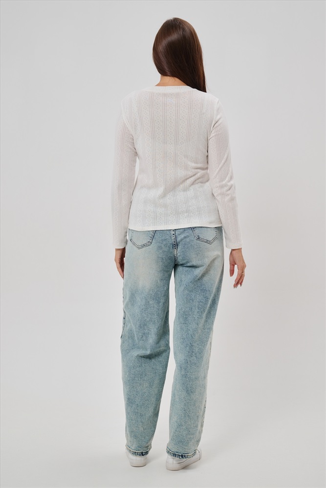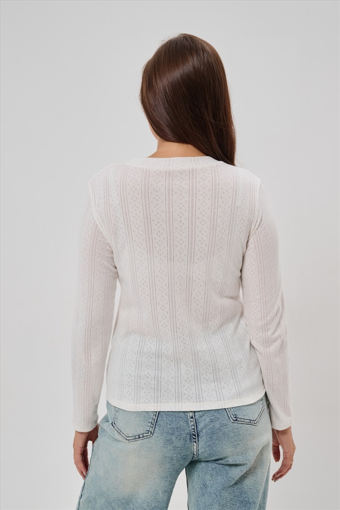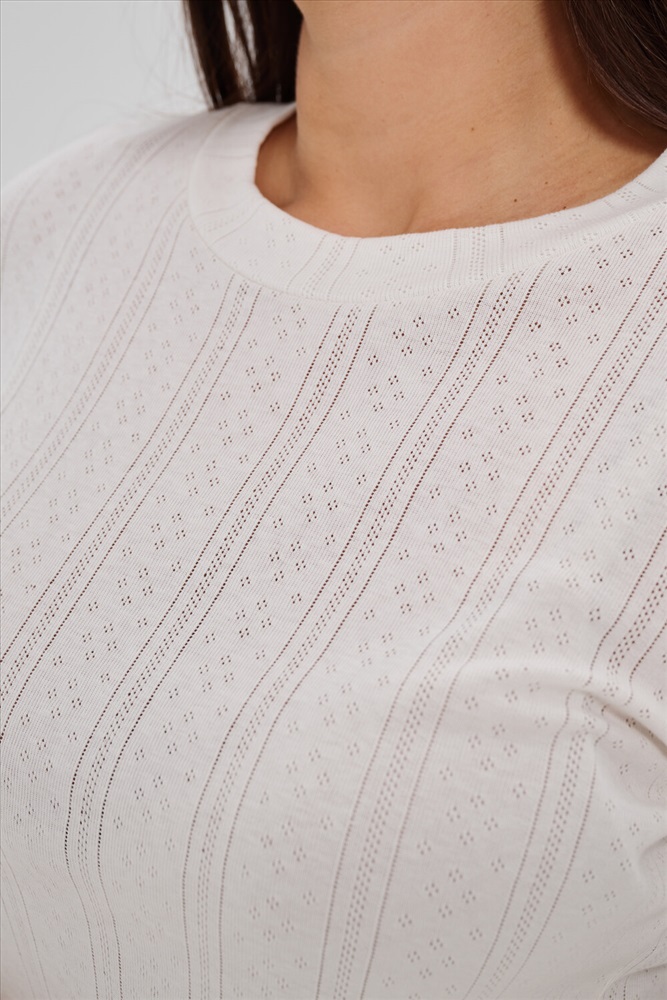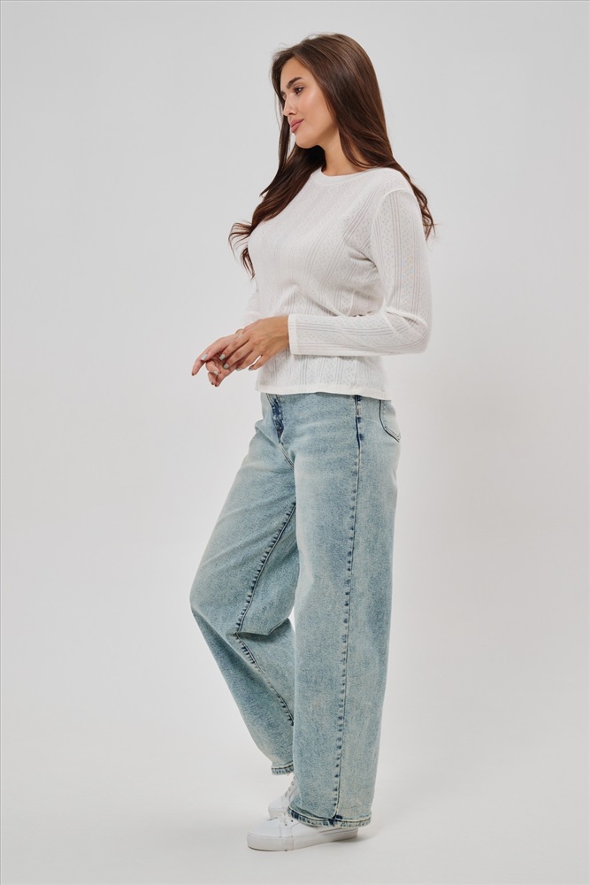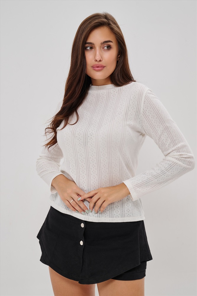 Застежка: без застежки Женский лонгслив из деликатного хлопкового трикотажа с ажурной вязкой. Приталенный крой создает изящный силуэт, подчеркивая природные очертания фигуры, а округлый вырез горловины обеспечивает удобство и эстетичное оформление зоны декольте. Материал нежно прикасается к коже, дарит приятные тактильные ощущения и дополнительную заботу о комфорте. Наличие сдвоенных размеров позволяет выбирать оптимальный вариант посадки согласно индивидуальным особенностям фигуры. Лонгслив идеально впишется в ваш гардероб, дополнив повседневные образы легкой романтичной нотой.