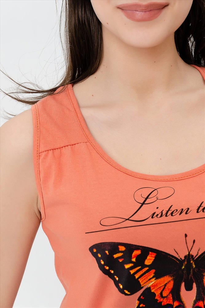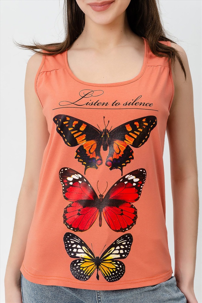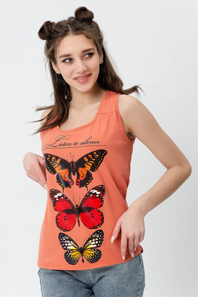 ID товара: 829516 Состав: 100% Хлопок Сезон: Весна/Лето Длина: Средняя Фасон: Прямой Рукав: Без рукавов Вырез горловины: U-образный Рисунок: бабочки Декоративные элементы: Печатный принт Основная ткань: Хлопок | Кулирка Стиль: Повседневный Страна бренда: Россия Страна производства: Россия Майка женская с красивым принтом "бабочки" и перепадом длины Комментарии к товару
