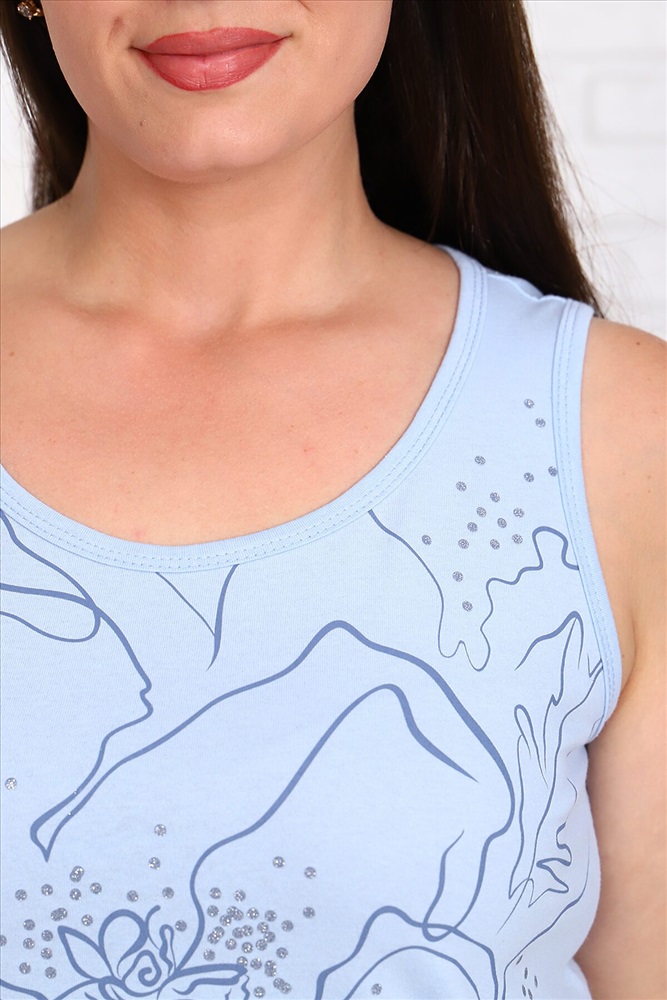 ID товара: 793399 Состав: 100% Хлопок Сезон: Весна/Лето Длина: Средняя Фасон: Свободный крой Рукав: Без рукавов Вырез горловины: Округлый Рисунок: цветочный Декоративные элементы: Печатный принт Основная ткань: Хлопок | Кулирка Стиль: Повседневный Страна бренда: Россия Страна производства: Россия Майка женская. На полочке майки нежный принт. Модель свободного кроя, с закругленным низом. Горловина и проймы обработана окантовкой в цвет. Комментарии к товару