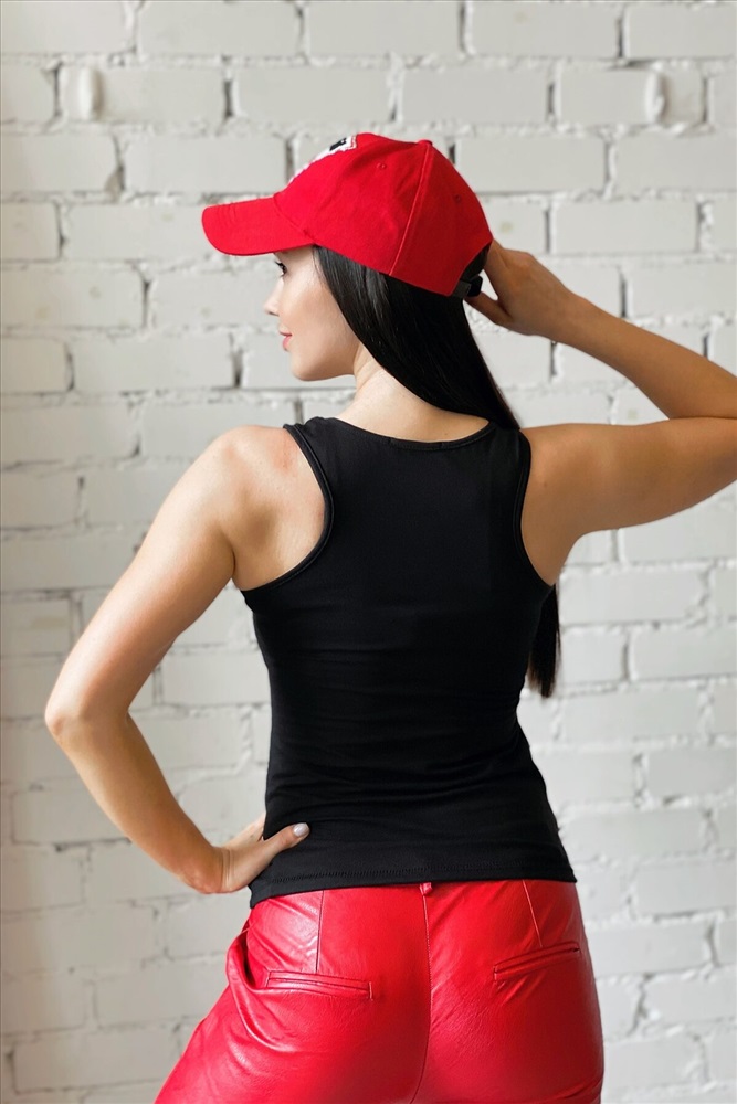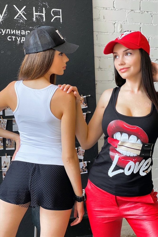 Майка-борцовка прилегающего силуэта, средней длины, с округлой горловиной. Горловина и проймы майки обработаны бейкой из основного полотна.