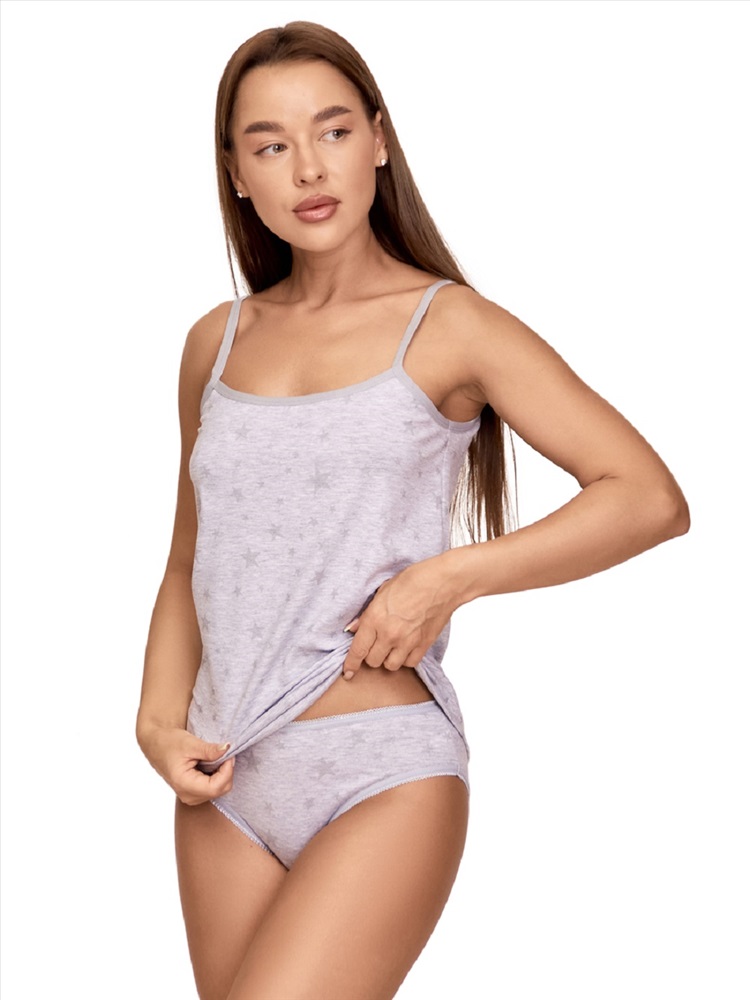 Стиль: домашний Майка-топ DiColore на тонких бретелях, выполнена из трикотажного полотна качества пенье в цвете серый меланж с рисунком звезды в тон основной ткани методом нанесения глиттер. Майки обладают хорошей растяжимостью и удобно облегают фигуру. Бретельки выполнены из тянущейся окантовочной лены, что так же позволяет обеспечить посадку на фигуре с учетом индивидуальных особенностей.