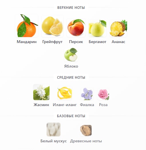 Верхние ноты: Мандарин, Грейпфрут, Персик, Бергамот, Ананас и Яблоко; средние ноты: Жасмин, Иланг-иланг, Фиалка и Роза; базовые ноты: Белый мускус и Древесные ноты.