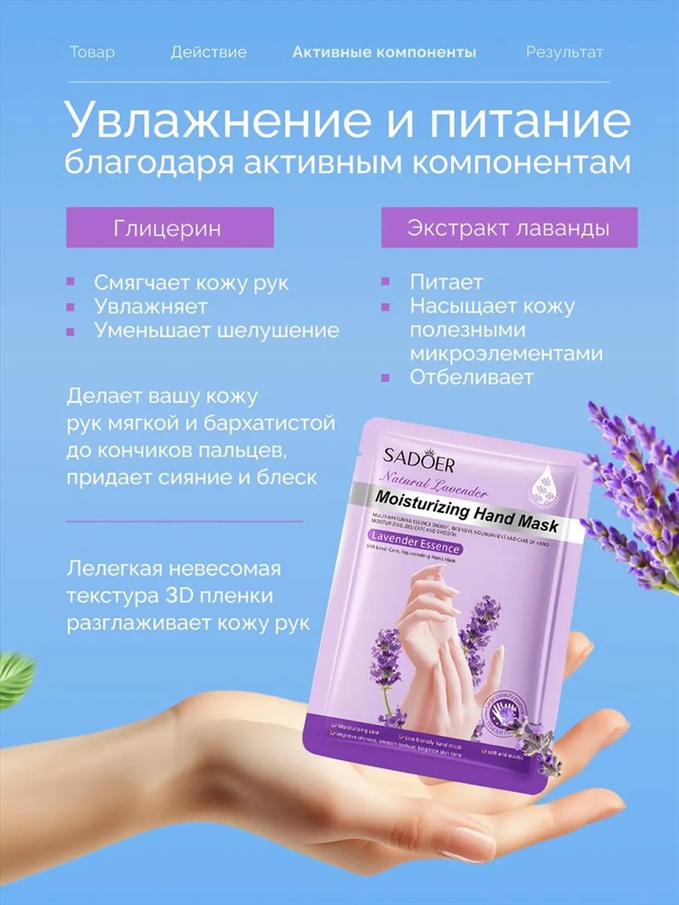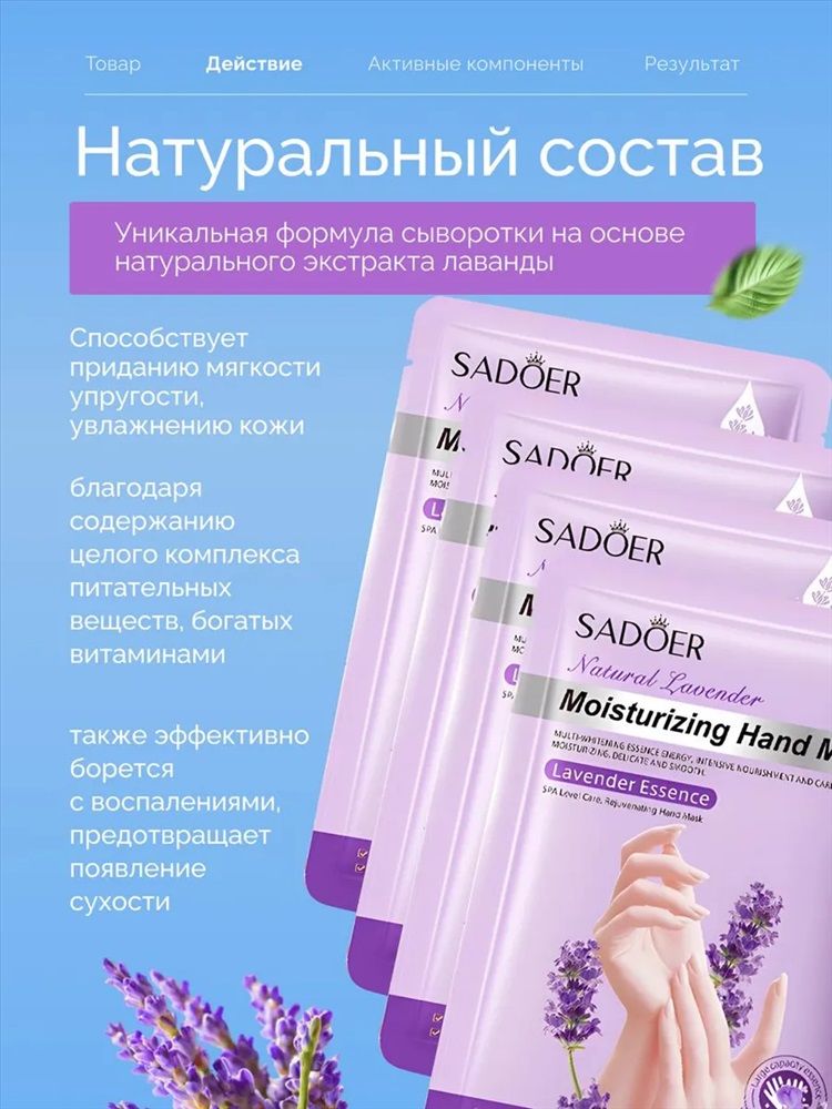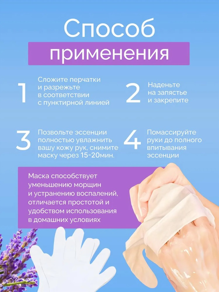 Скидка: любая | от 10% и больше | от 30% и больше Маски в форме перчаток созданы специально для бережного и эффективного ухода за кожей рук. Они представлены в наборе из 4 штук. В подарок к этому комплекту от бренда Sadoer прилагается одна тканевая масочка для лица. Изделия в необычном формате одноразовых перчаток обладают безопасным, тщательно подобранным составом. Уникальная формула сыворотки на основе натурального экстракта лаванды способствует приданию мягкости и упругости, глубокому увлажнению кожи. В ней содержится целый комплекс питательных веществ, богатых витаминами. Несмываемая уходовая косметика с глубоким увлажняющим и восстанавливающим эффектом дарит женским рукам красоту и естественное сияние. Бьюти - средство эффективно против пигментации, благодаря осветляющему действию. Его можно смело назвать многофункциональным. Продукт способствует уменьшению морщин и устранению воспалений, отличается простотой и удобством использования в домашних условиях. Перчатки представлены в универсальном размере.