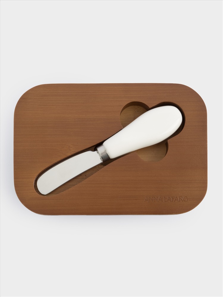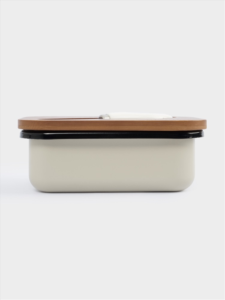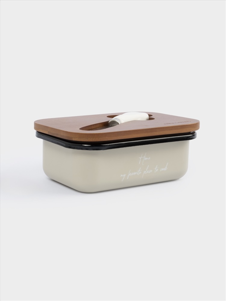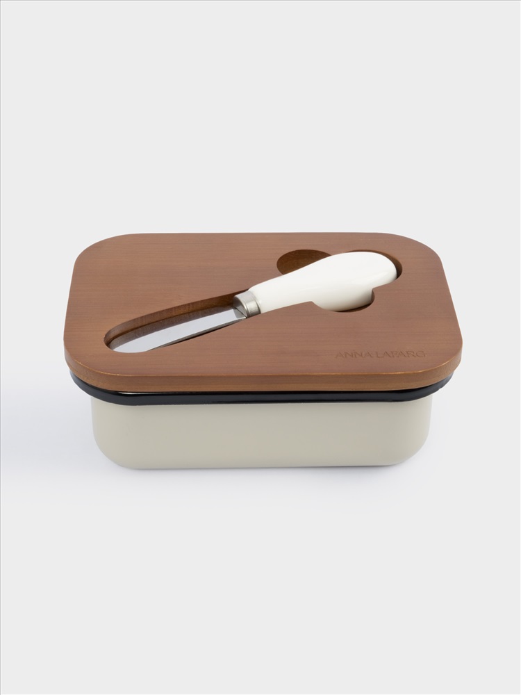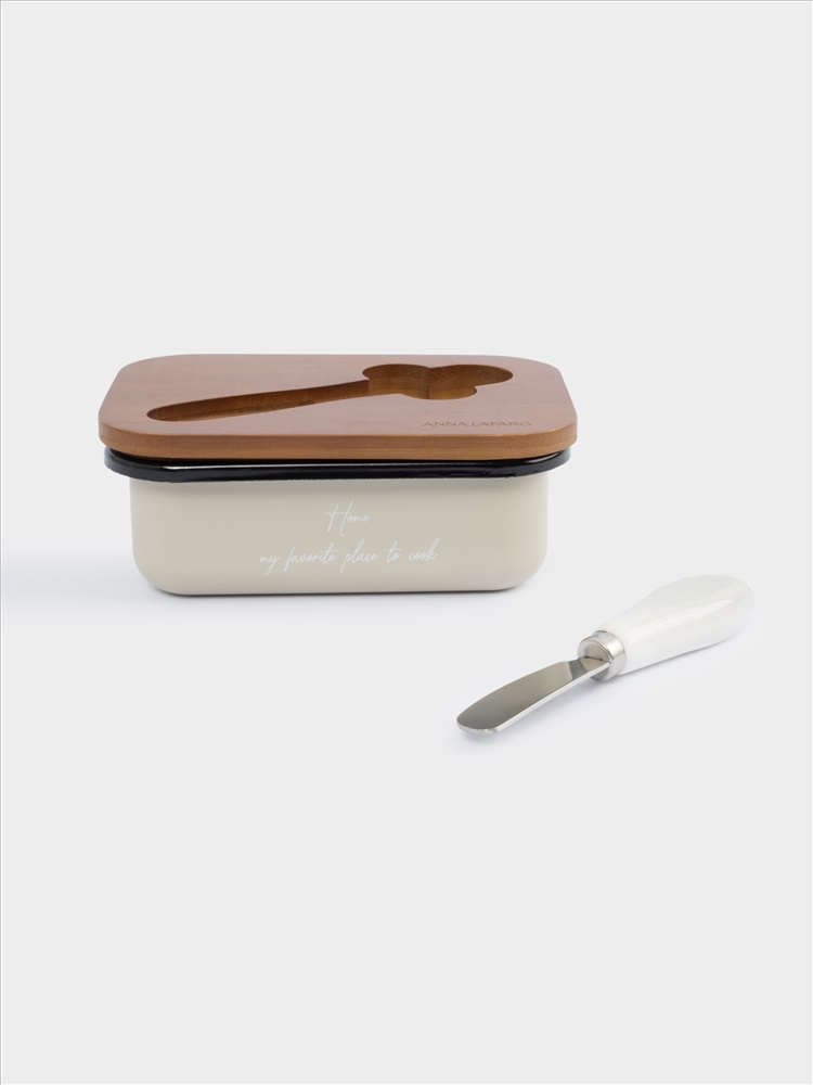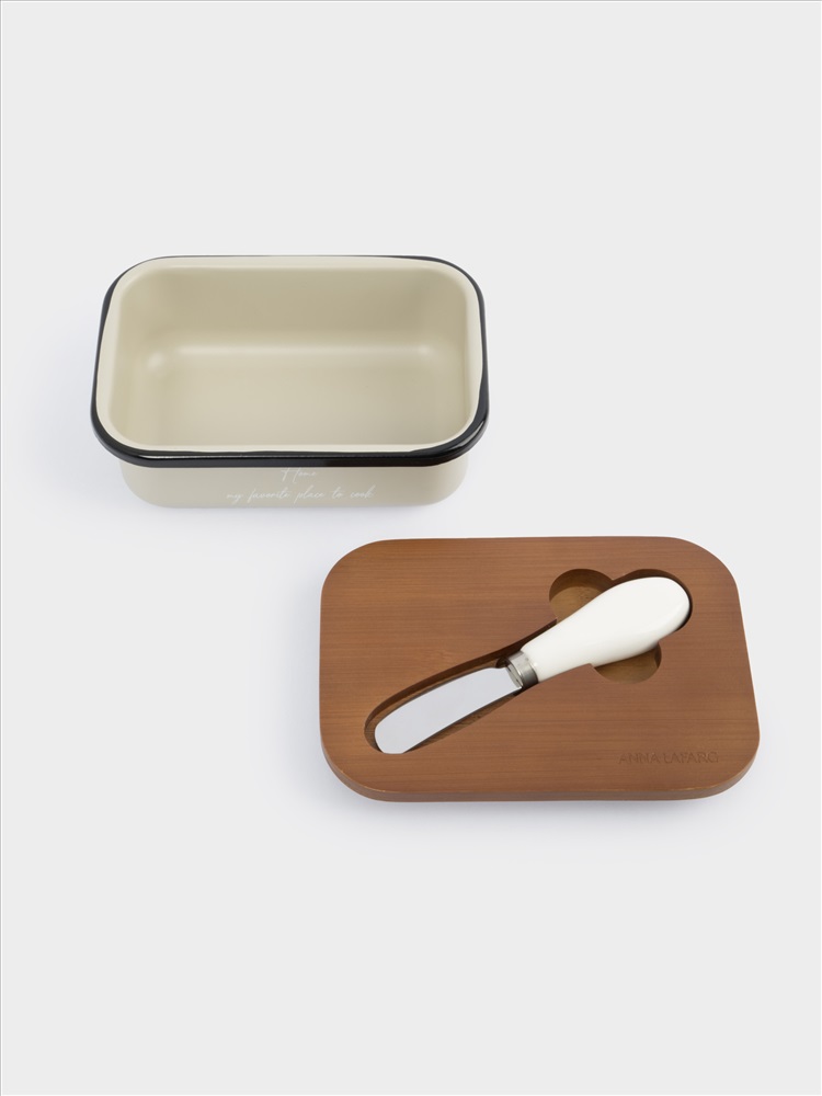 Масленка с ножом. Размер: 16х11х6,5 см. Материал: железо с цветным напылением, бамбук, нержавеющая сталь, силикон, керамика. Рекомендации по уходу: мыть вручную с применением мягких моющих средств. Не использовать для ухода абразивные чистящие средства и жесткие губки. Нельзя мыть в посудомоечной машине.