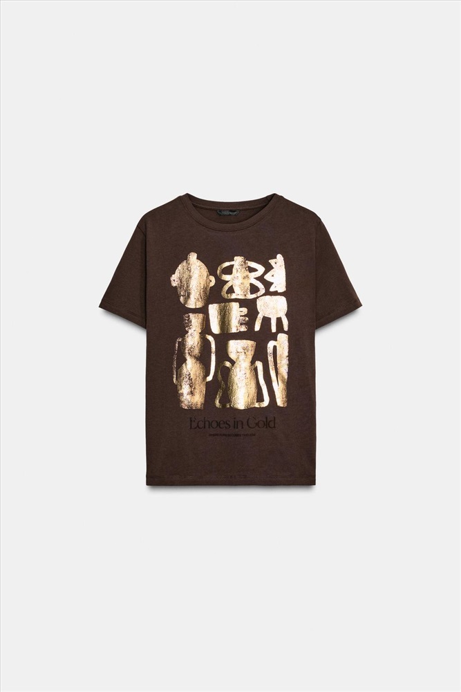 Short sleeve T-shirt with a round neck. Featuring a contrast metallic print detail. Straight hem.