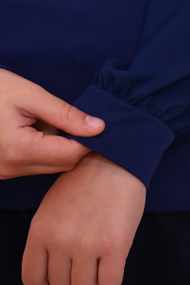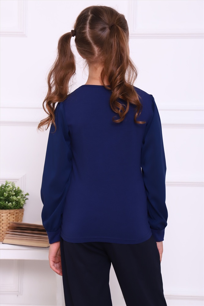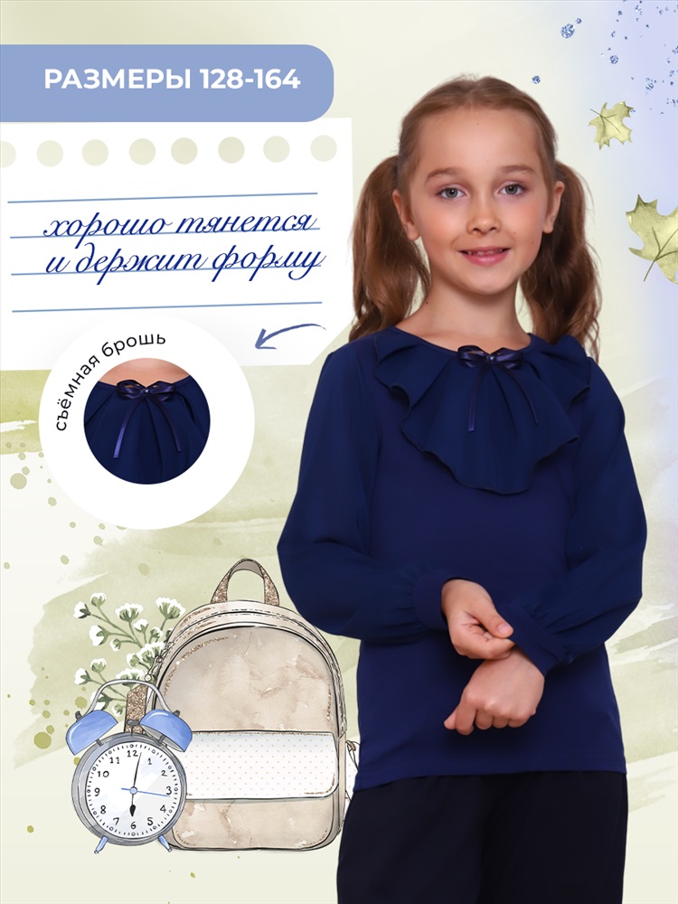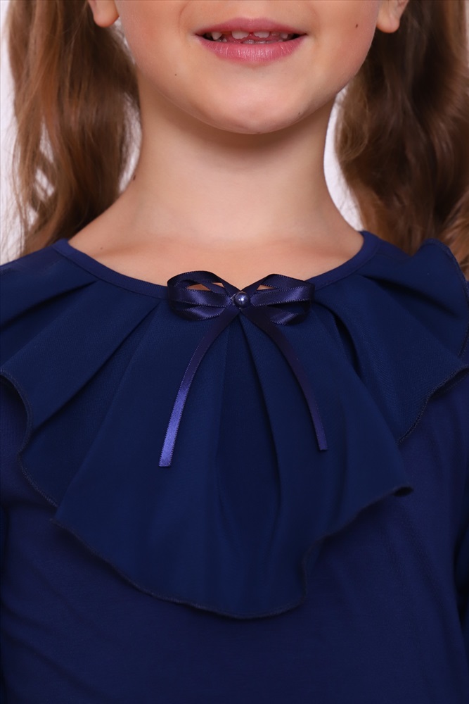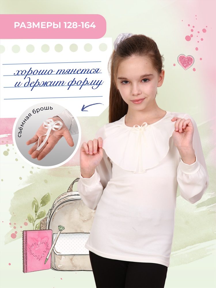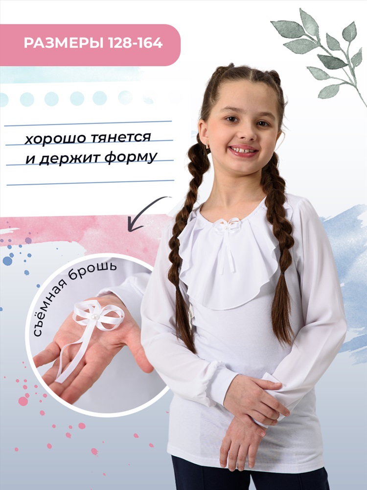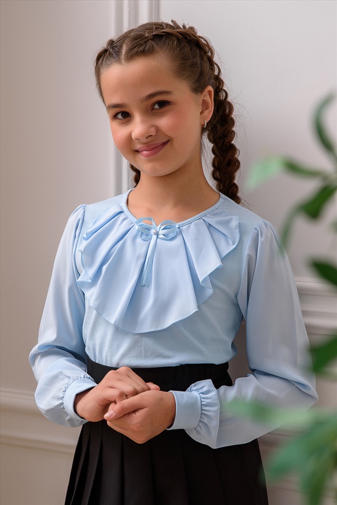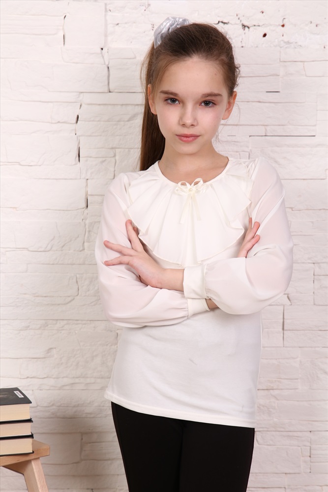 Стиль: для школы | повседневный Блузка для девочек младшего школьного возраста, из однотонного трикотажного полотна - однотонная кулирка с лайкрой и шифона. Блузка полуприлегающего силуэта, с рукавом из шифона, без застежки. Спереди жабо со складками из шифона с декоративным элементом по центру. На спинке отсутствуют линии членения. Рукав длинный одношовный, присборенный по окату и низу, на манжете. Низ изделия подогнут. Срез горловины окантован.