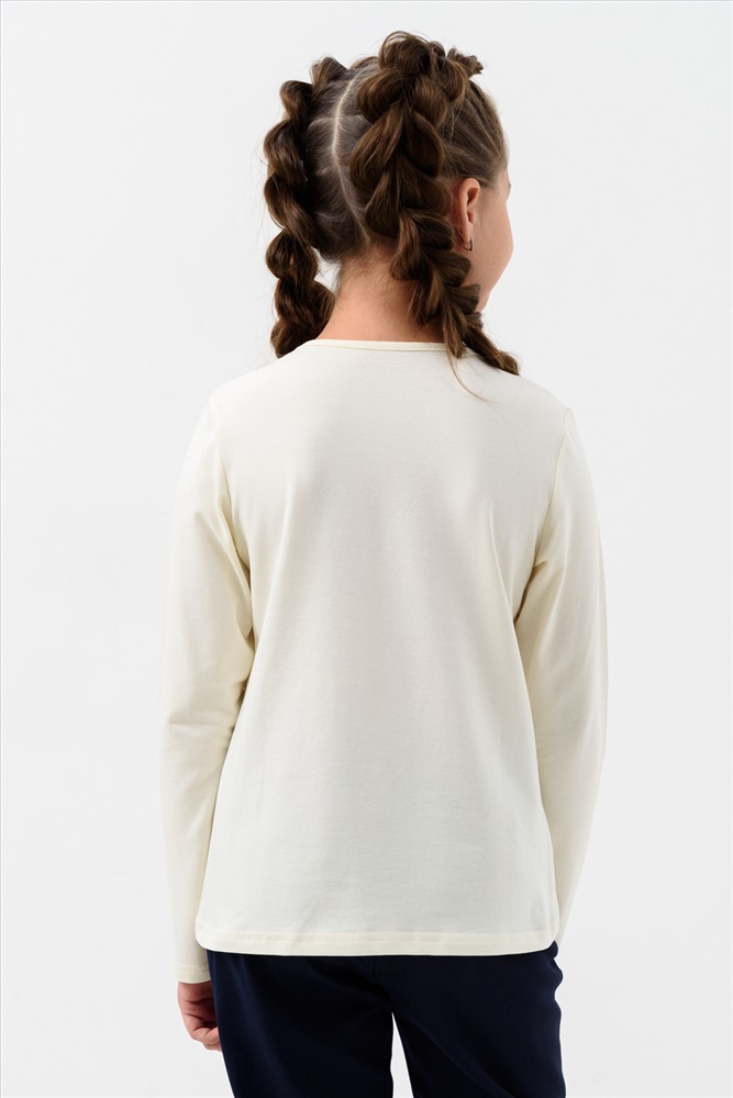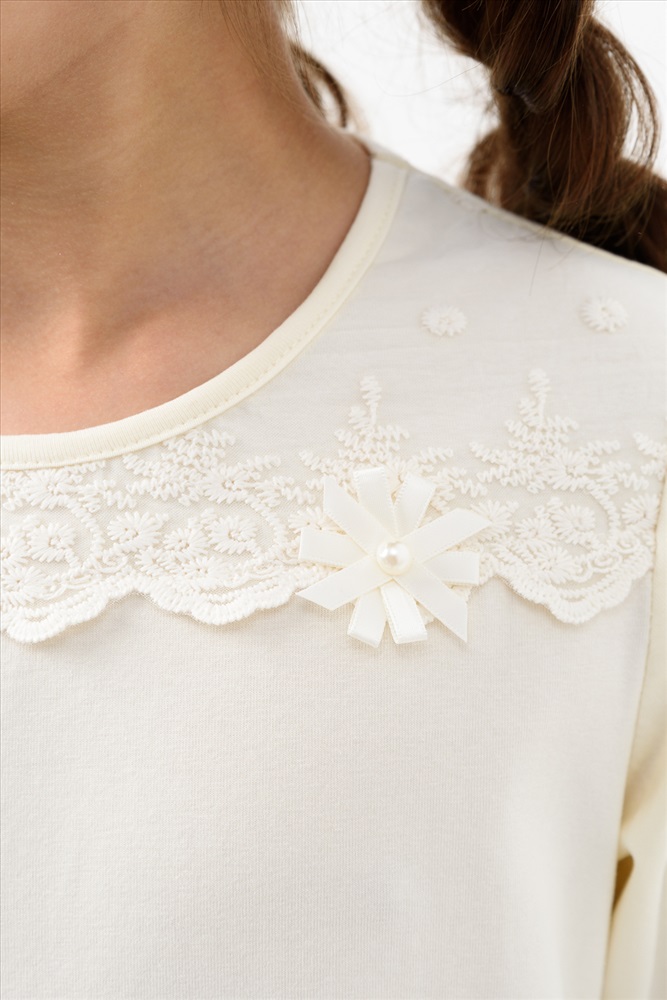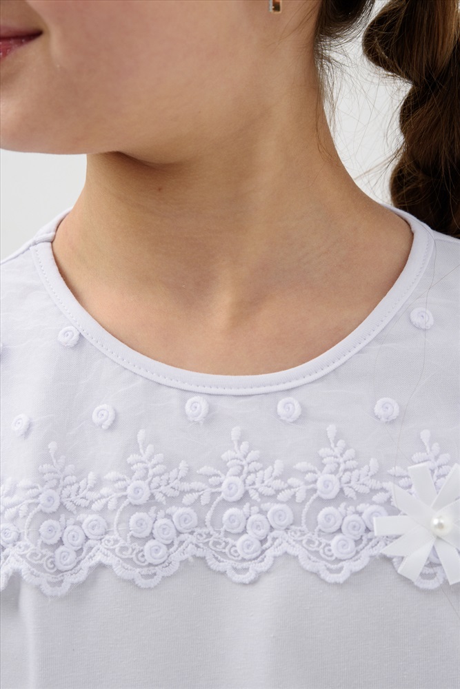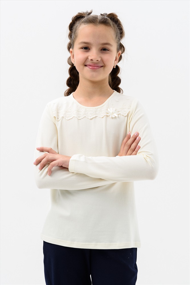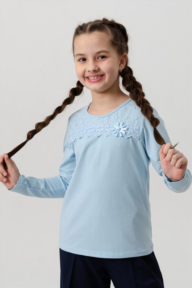 Застежка: без застежки Блузка школьная для девочки с трикотажными длинными рукавами, круглым вырезом горловины, без застежки, прилегающего силуэта, на деталь переда настрочена кружевная кокетка, спереди на кружево сбоку прикреплен декоративный элемент. Сшита из однотонного мягкого хлопкового трикотажного материала с добавлением в состав хлопка 92% и лайкры 8 %. Школьная форма украсит и дополнит любой образ не только в школу, но и для повседневной носки, на день рождения, фотосессию и для особых случаев. Блузка отлично сидит по фигуре, движения в нем комфортные, позволяет выглядеть ребенку изящно. Отлично сохраняют цвет и форму при активной носке и после многократных стирок. Используемый материал блузки мягкий и приятный телу, устойчив к износу, не садится, не образует катышек на поверхности, имеет эффектный внешний вид.