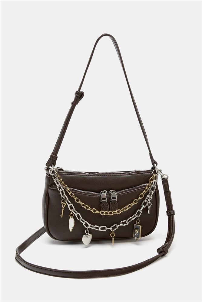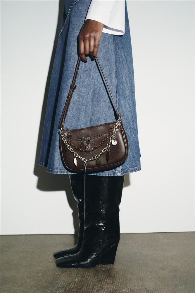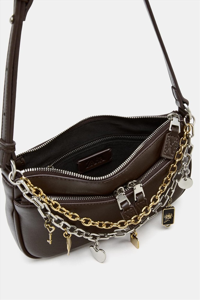 Mini bag with a chain and detachable charms on the front. Front zip pocket. Shoulder strap and a detachable crossbody strap. Interior zip pocket. Metal zip fastening. COMPOSITION, CARE & ORIGIN COMPOSITION OUTER SHELL STRAP 70% zamak MAIN MATERIAL 100% polyurethane LINING 100% polyester Which contains at least: LINING 100% RCS certified recycled polyester CERTIFIED MATERIALS RCS CERTIFIED RECYCLED POLYESTER Nowadays, recycled polyester is mainly made from PET plastic waste. This is a type of plastic that is widely used in a variety of items, such as plastic bottles. Using recycled materials helps limit the production of virgin polyester fibre. It is certified to the Recycled Claim Standard (RCS), which verifies the recycled content and tracks it from source to final product. Certified by Intertek 193334 More information CARE Caring for your garments to extend their useful life. Simple steps like cleaning your items with a dry cotton cloth or a soft brush, depending on the characteristics of the product, can help you care for it.