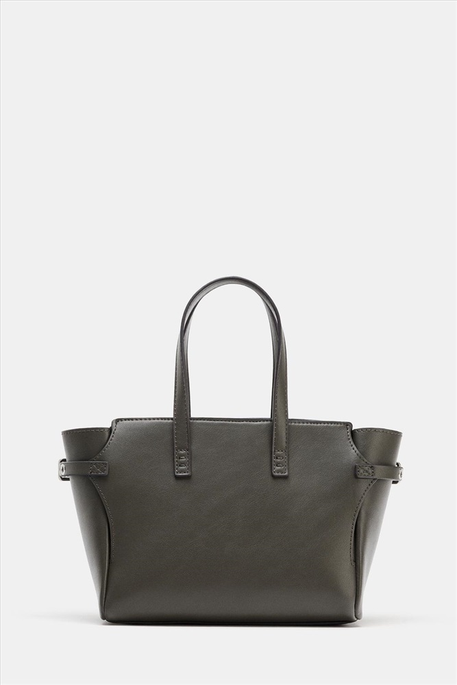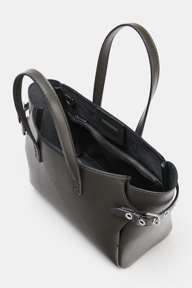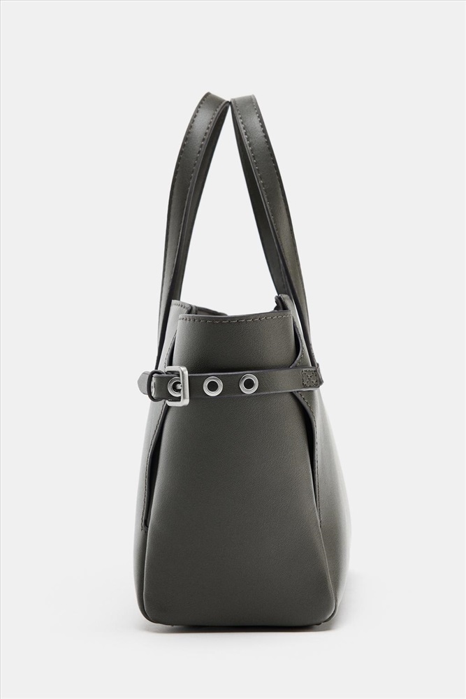 Mini tote bag. Featuring metal eyelet details on the sides. Double top handle and a detachable shoulder strap. Inside compartment with zip closure. Magnetic clasp closure.