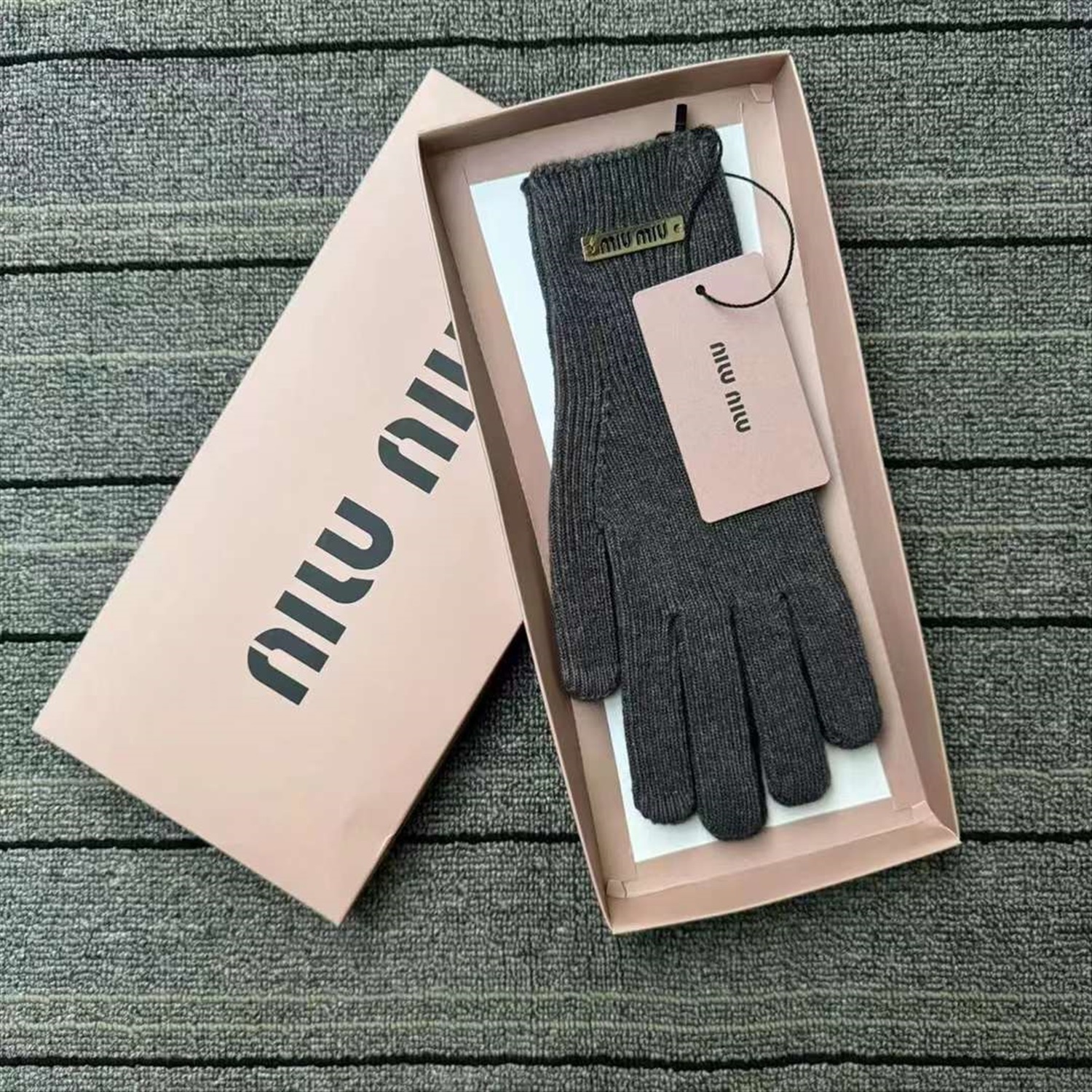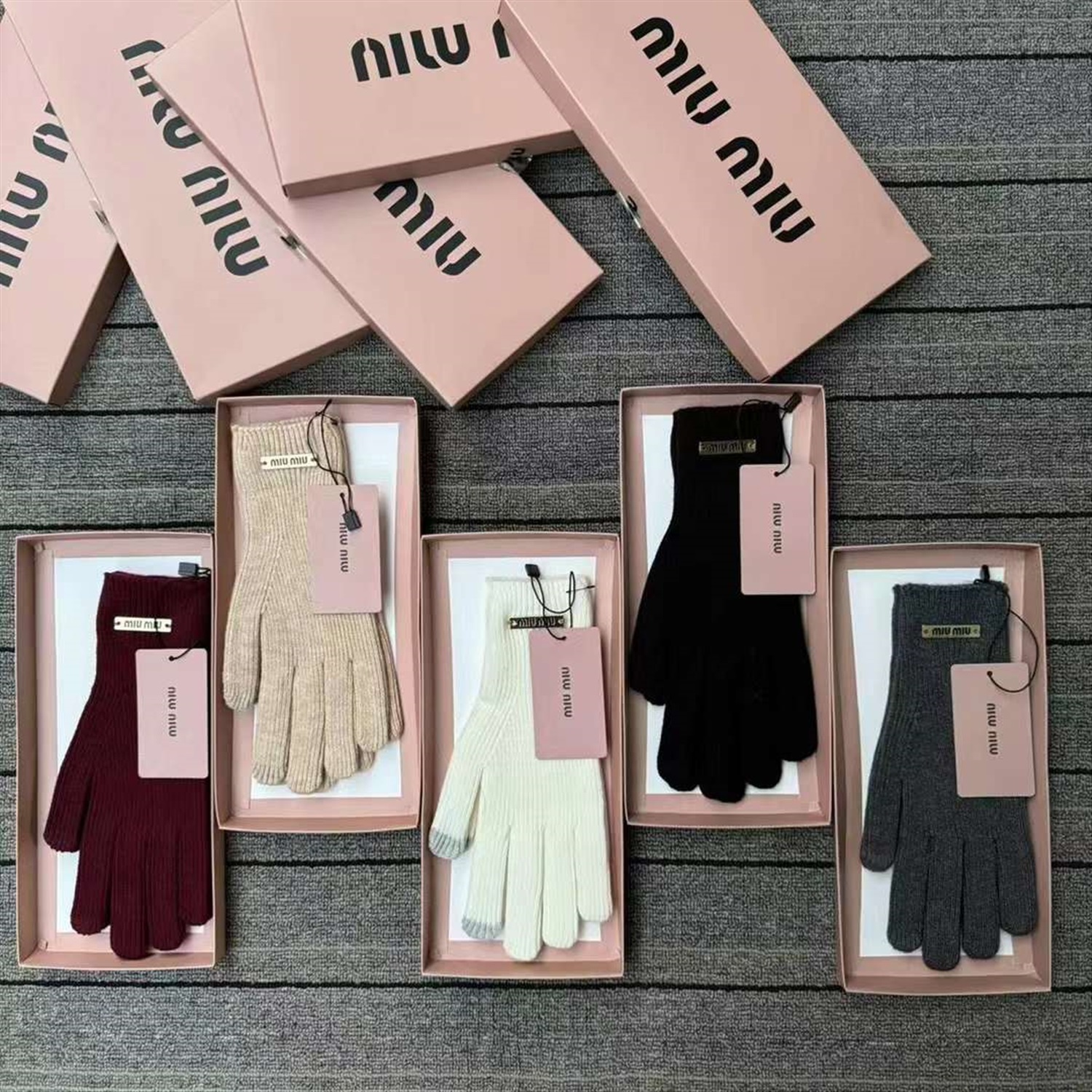 Miu Miu зимние теплые кашемировые женские перчатки с двусторонней полоской и металлической этикеткой, с сенсорным экраном. Доступны в пяти цветах: чёрный, белый, серый, красный и кофейный, 1 пара в оригинальной подарочной упаковке