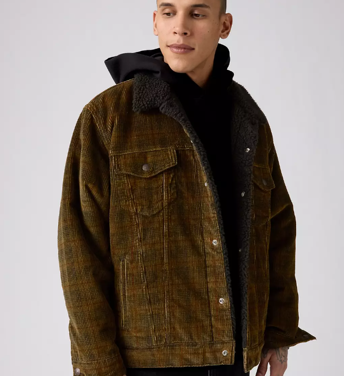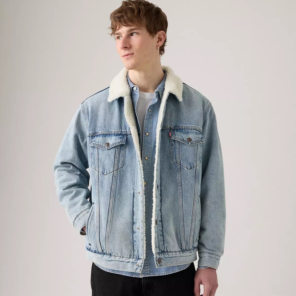 Model is 6'1", Waist 29", Wearing a Size M Levi's® Premium Relaxed Fit Sherpa Trucker Jacket