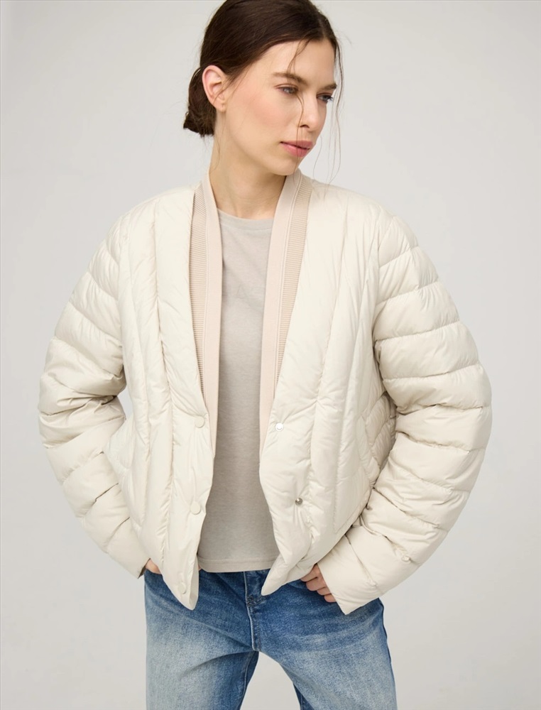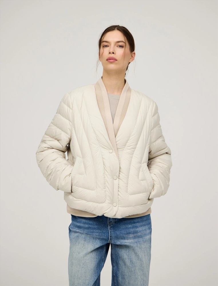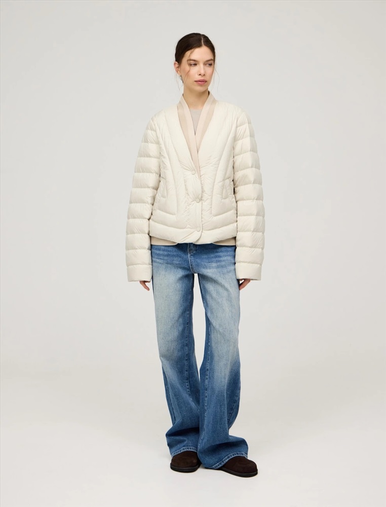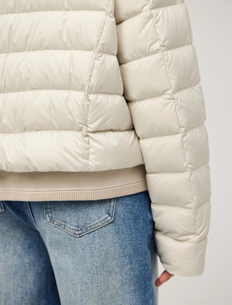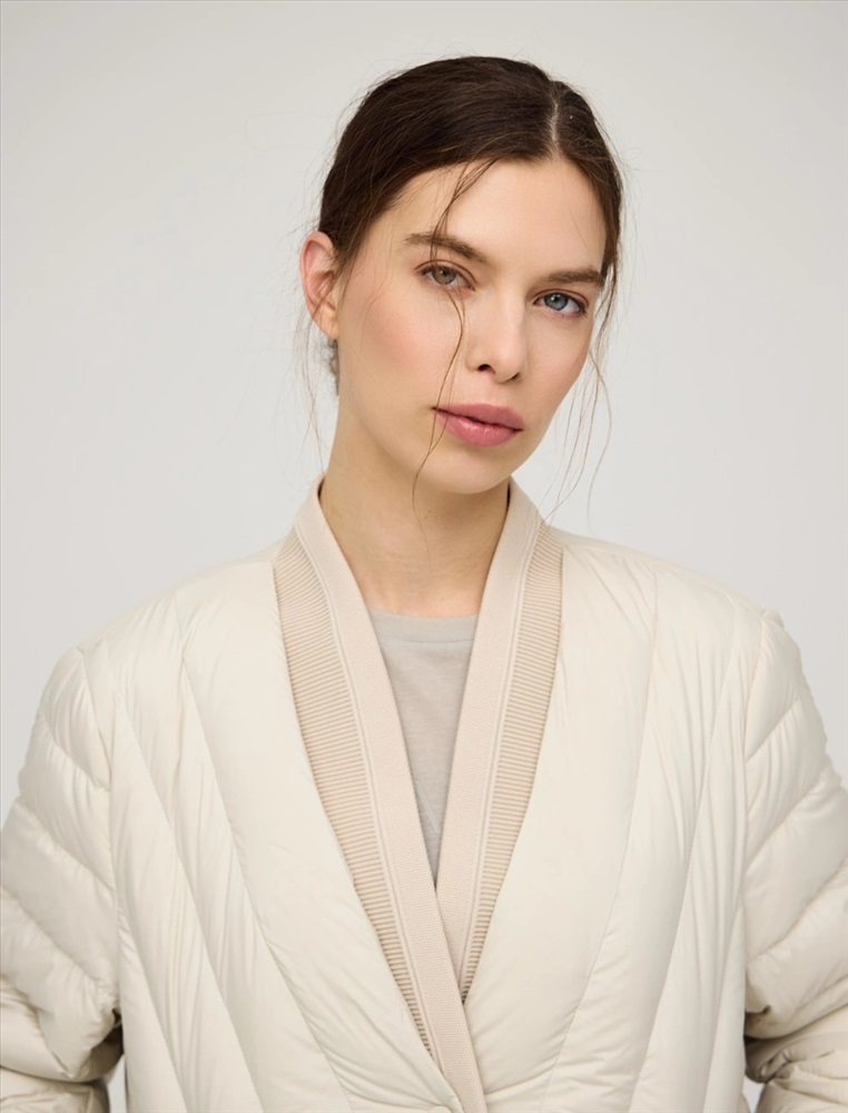 Стеганая куртка регулярного силуэта с трикотажным шалевым воротником. По передней части изделия застежка на кнопки и два прорезных кармана-листочки. В составе утеплителя утиный пух (90%) и утиное перо, обеспечивающие тепло и легкость в носке. Трикотажная вставка по низу изделия дополнительно защищает от холода. Ткань верха и подкладка выполнены из полиэстера. Представлена в молочном и коричневом оттенке.