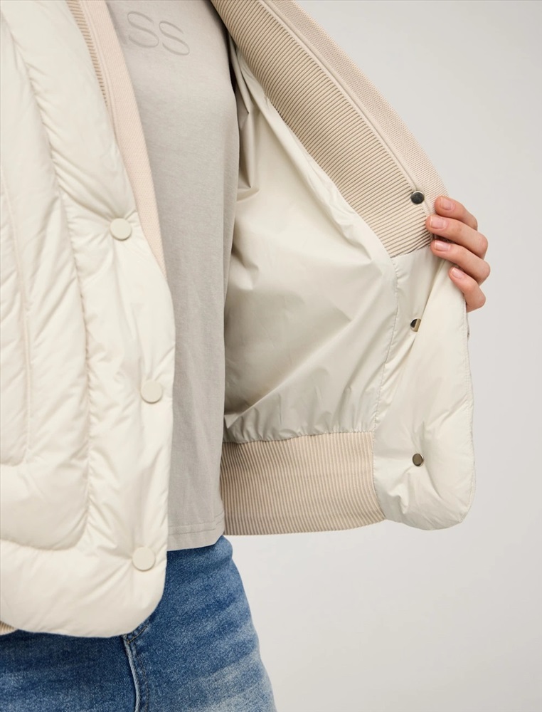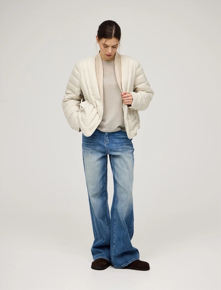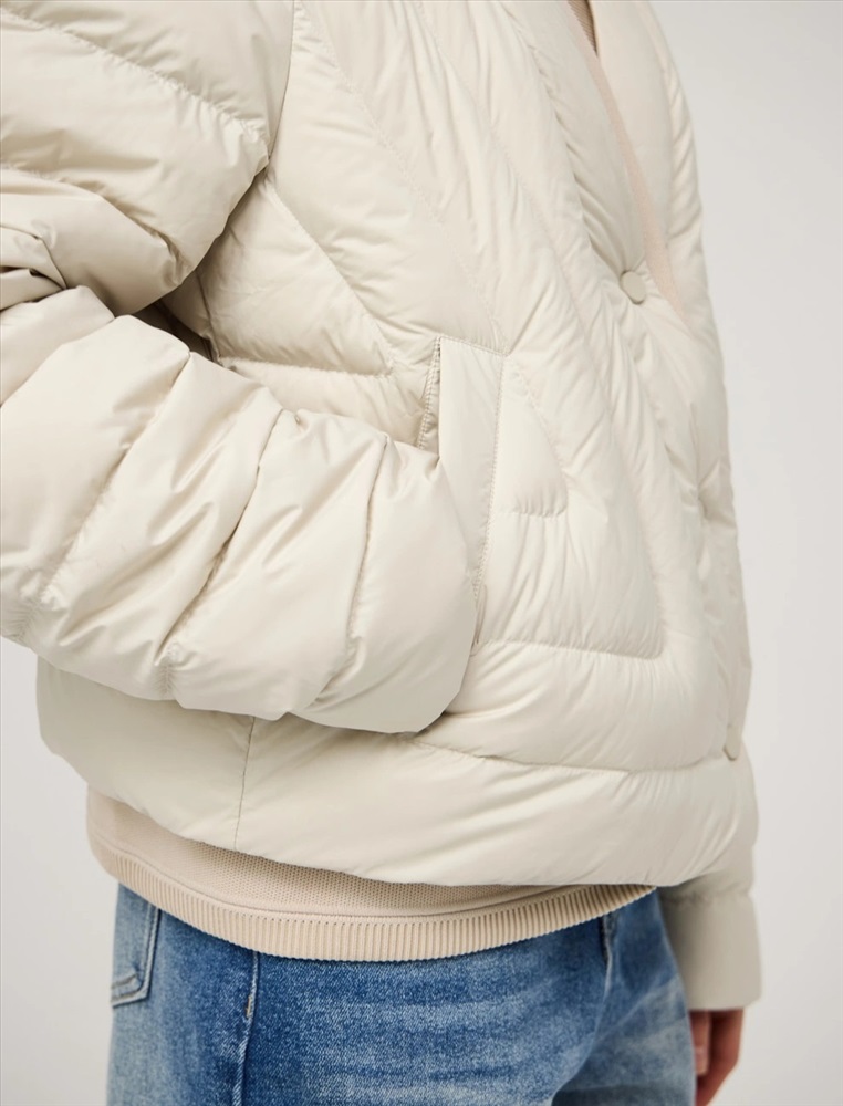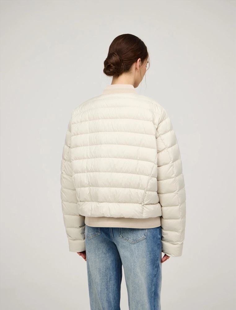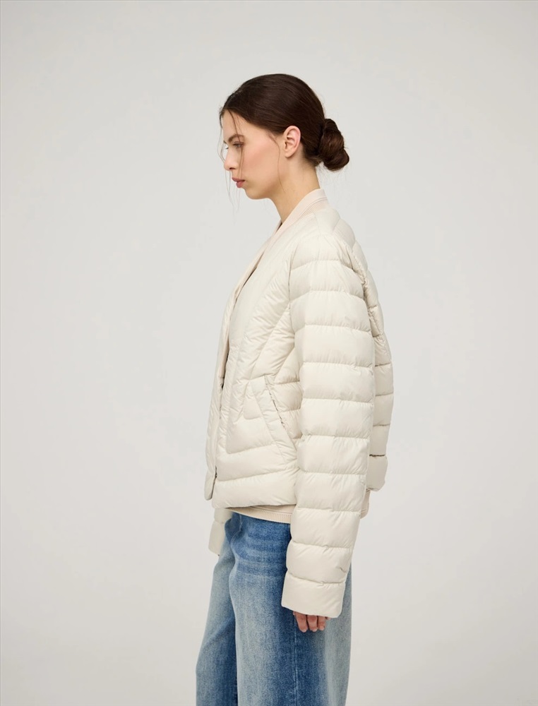 Стеганая куртка регулярного силуэта с трикотажным шалевым воротником. По передней части изделия застежка на кнопки и два прорезных кармана-листочки. В составе утеплителя утиный пух (90%) и утиное перо, обеспечивающие тепло и легкость в носке. Трикотажная вставка по низу изделия дополнительно защищает от холода. Ткань верха и подкладка выполнены из полиэстера. Представлена в молочном и коричневом оттенке.
