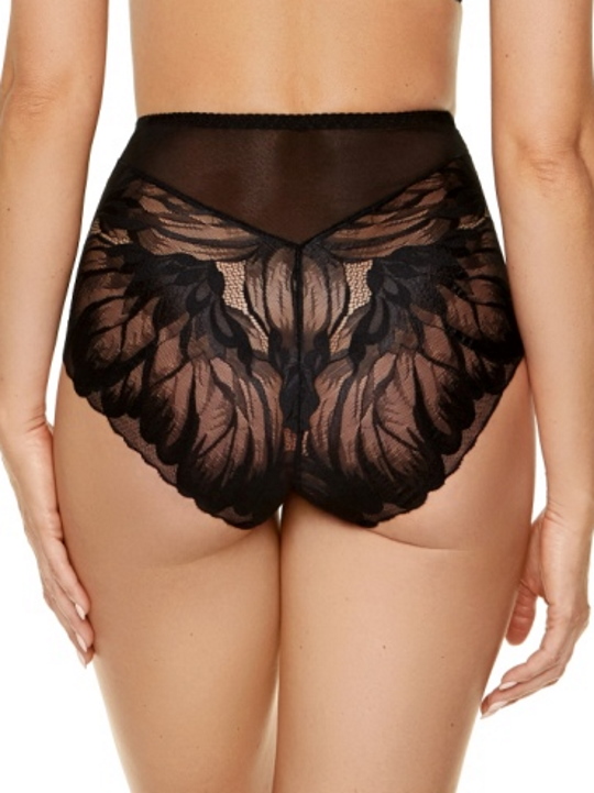 Состав: полиамид 55%, полиэстер 22%, хлопок 10%, вискоза 8%, эластан 5% Трусики слип с высокой линией талии из коллекции Moon спереди  из эластичного черно-зеленого кружевного полотна, черной сетки и атласной ткани, спинка из сетки и кружева. Ластовица из 100% хлопка. Пояс из атласной ткани. Идеально сочетаются с бюстгальтерами Moon.