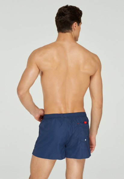 Мужские мини-шорты свободного кроя. Выполнены из легкой быстросохнущей ткани. Длина до середины бедра, на задней детали карман с клапаном. Пояс на резинке с контрастным шнуром. Внутри – вставка из мягкой сетки.