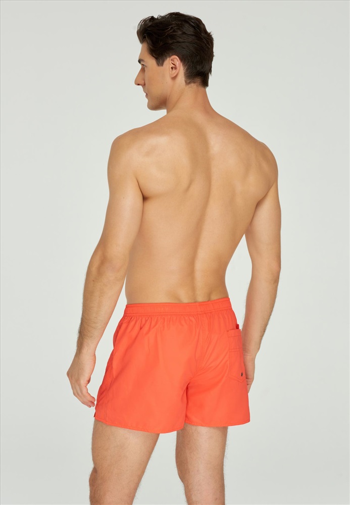 Мужские мини-шорты свободного кроя. Выполнены из легкой быстросохнущей ткани. Длина до середины бедра, на задней детали карман с клапаном. Пояс на резинке с контрастным шнуром. Внутри – вставка из мягкой сетки.