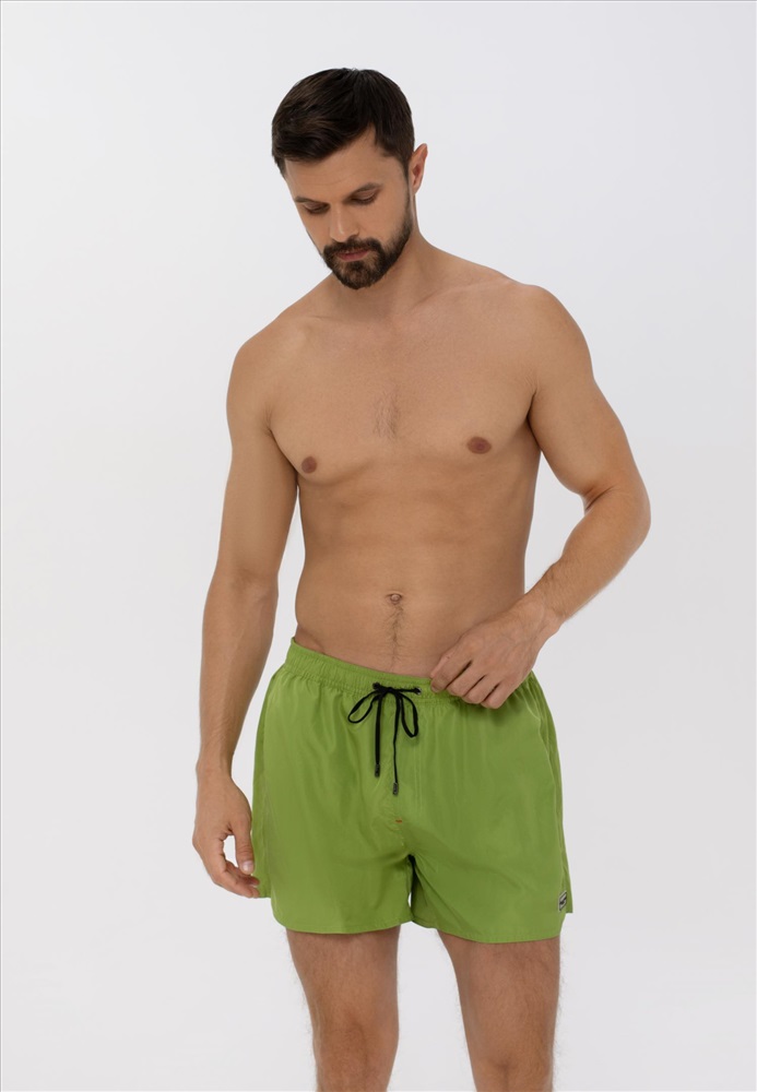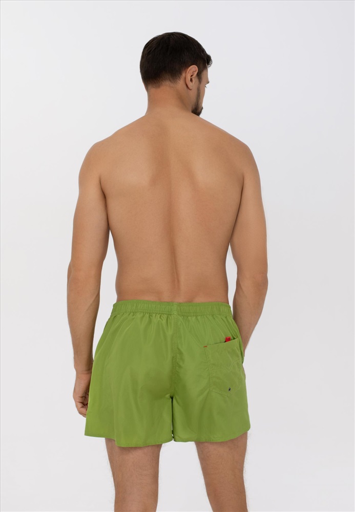 Мужские мини-шорты свободного кроя. Выполнены из легкой быстросохнущей ткани. Длина до середины бедра, на задней детали карман с клапаном. Пояс на резинке с контрастным шнуром. Внутри – вставка из мягкой сетки.