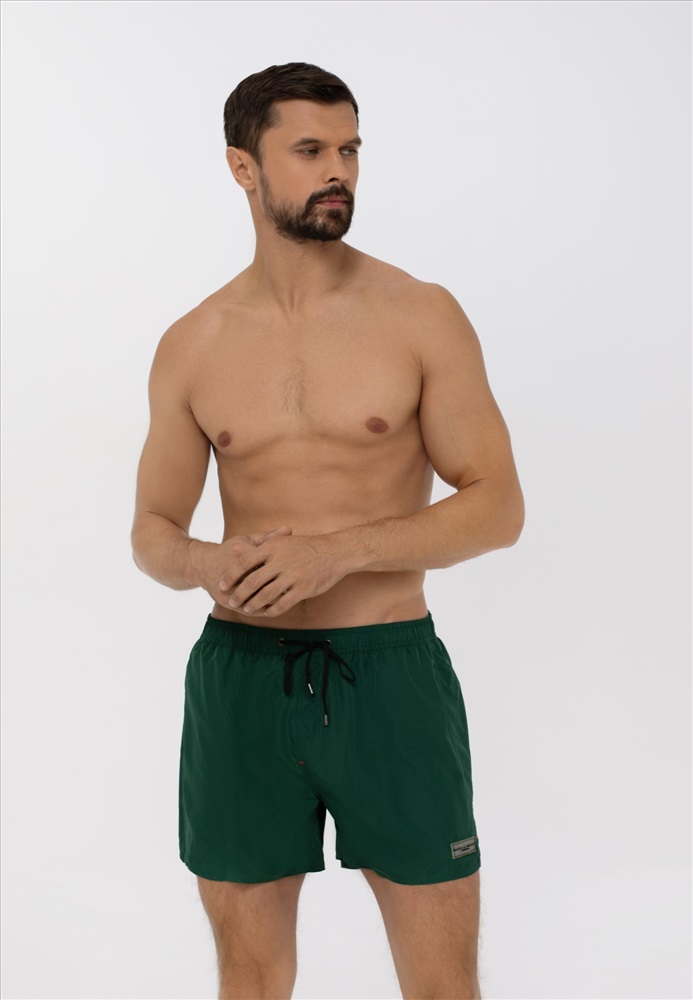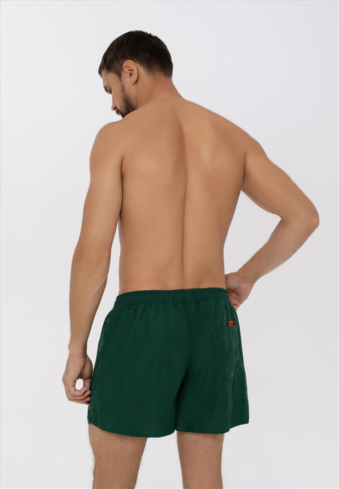 Мужские мини-шорты свободного кроя. Выполнены из легкой быстросохнущей ткани. Длина до середины бедра, на задней детали карман с клапаном. Пояс на резинке с контрастным шнуром. Внутри – вставка из мягкой сетки.