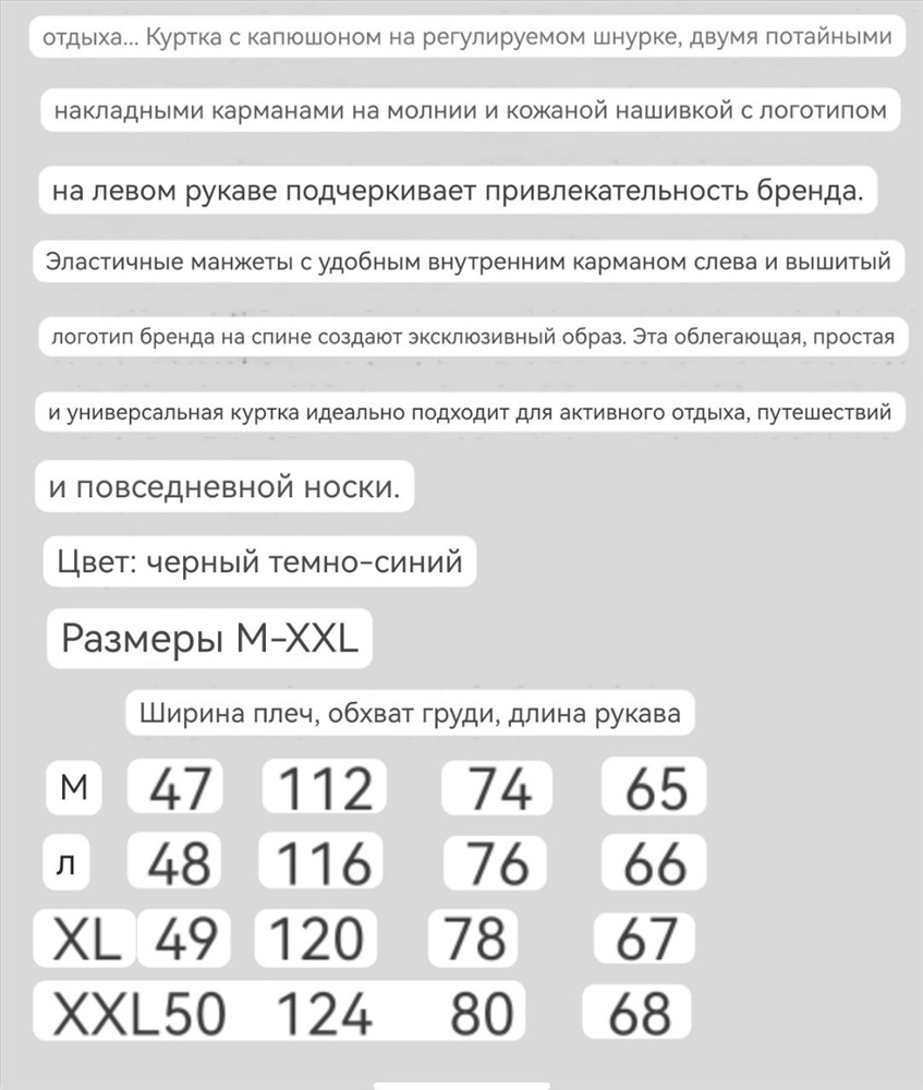 Материал: полиэф волокно,отделка (логотип, аксессуары) натуральная кожа Размеры: M, L, XL, 2XL Комментарии к товару